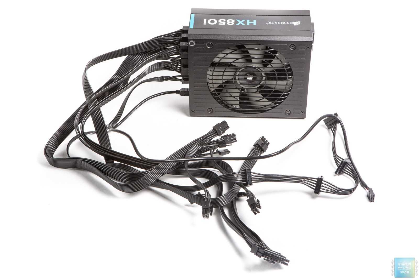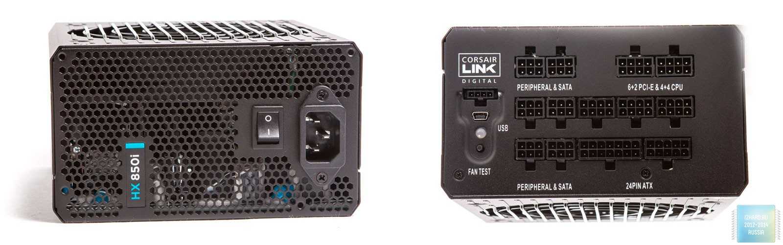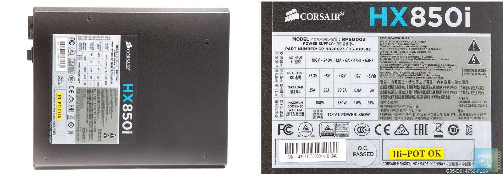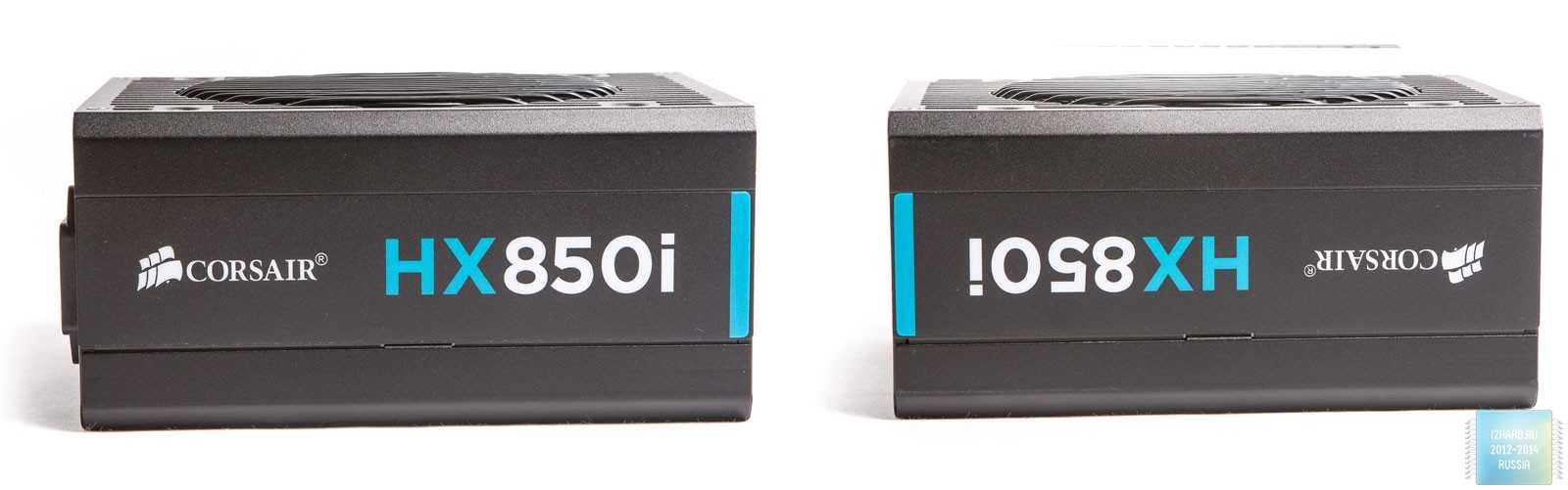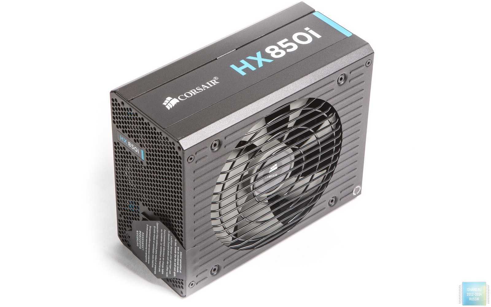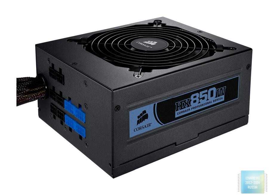 По бокам расположены логотипы компании производителя и надпись HX 850i с голубоватой вставкой.