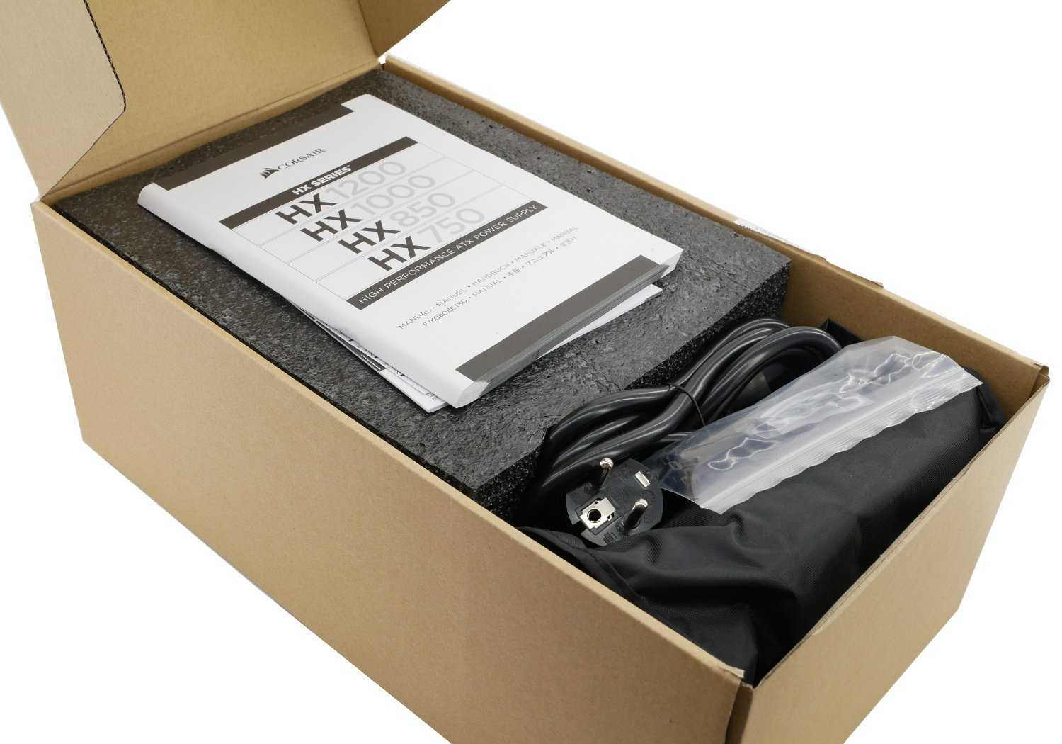 Непосредственно сам блок питания Corsair HX1200 и его свита располагается в дополнительной картонной коробке с логотипом компании Corsair для защиты компонентов при транспортировке.