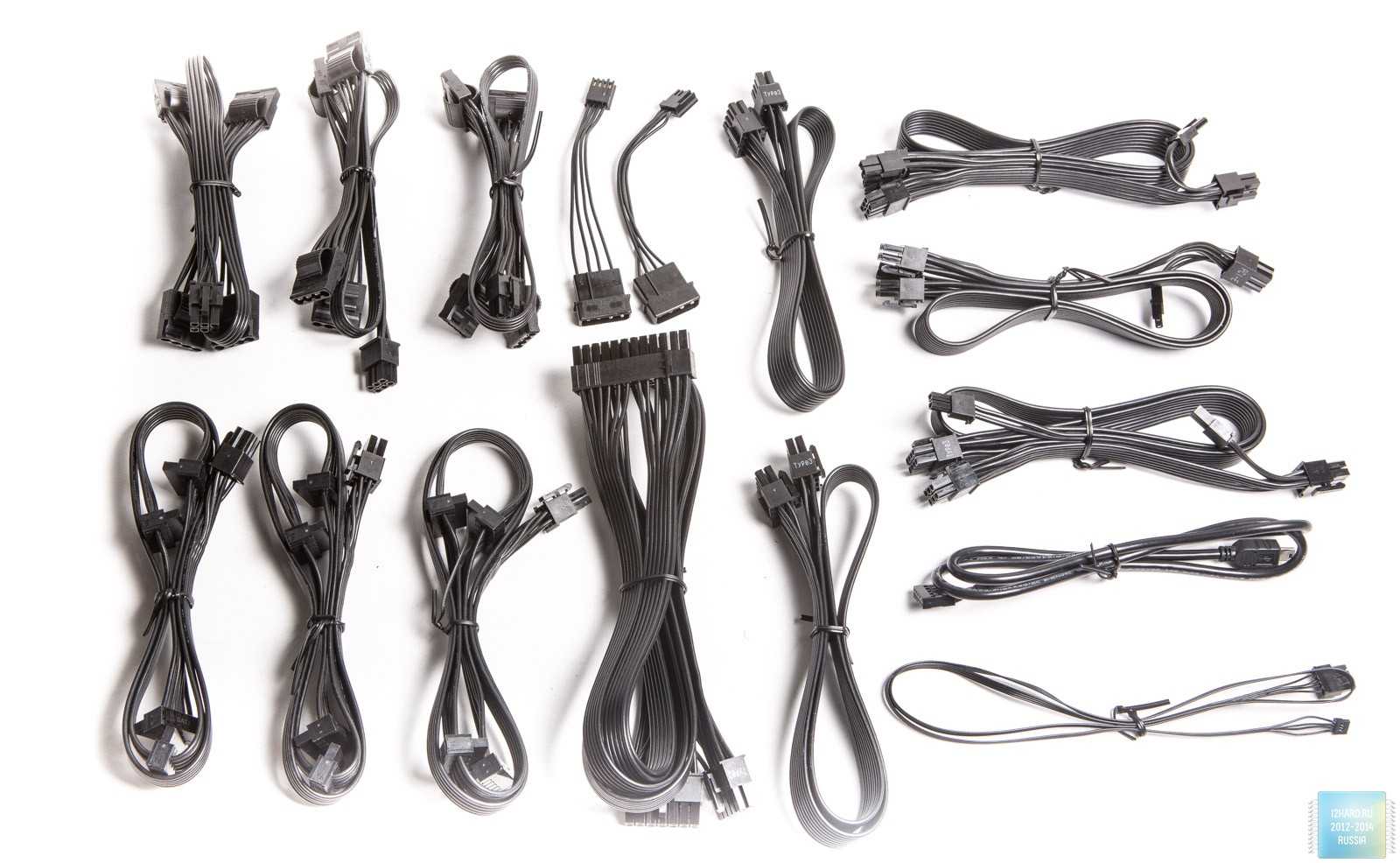 Блок питания Corsair HX1000i имеет полностью модульную систему подключения кабелей, в целом она нам понравилась. Кроме подсоединяемого кабеля ATX вы получите два 8-контактных кабеля EPS, один из которых длиннее обычного. Также есть возможность подключить до восьми коннекторов PCI Express, 12 SATA и 12 Molex, причём одновременно.