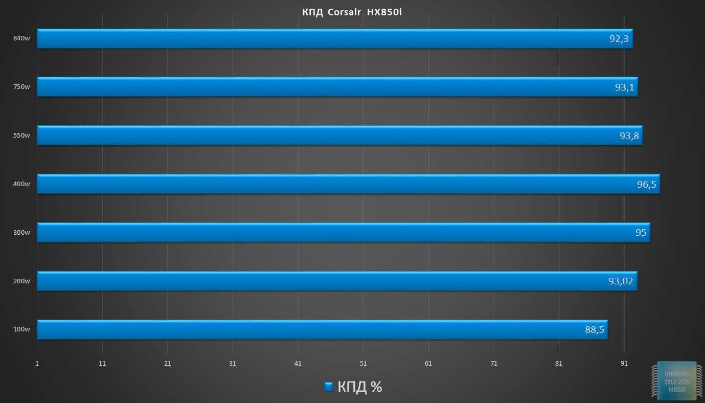 Corsair HX1000i в целом показал очень высокую эффективность на уровне 80PLUS Platinum, не уступив премиальным моделям конкурентов. Так что на практике блок питания хорошо дополняет семейство AXi, у которого нет модели на 1000 Вт.