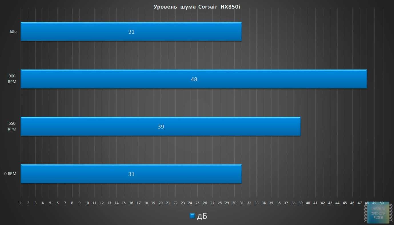 Блок питания Corsair HX1000i использует 135-мм вентилятор с гидродинамическим подшипником, который по умолчанию работает в полупассивном режиме, называемом Corsair «Zero RPM Mode». С помощью утилиты Corsair Link можно включить постоянную работу вентилятора на фиксированной скорости. Также Corsair указывает, что вся структура блока питания была оптимизирована под тихую работу, то есть вы не столкнетесь со свистом дросселей.