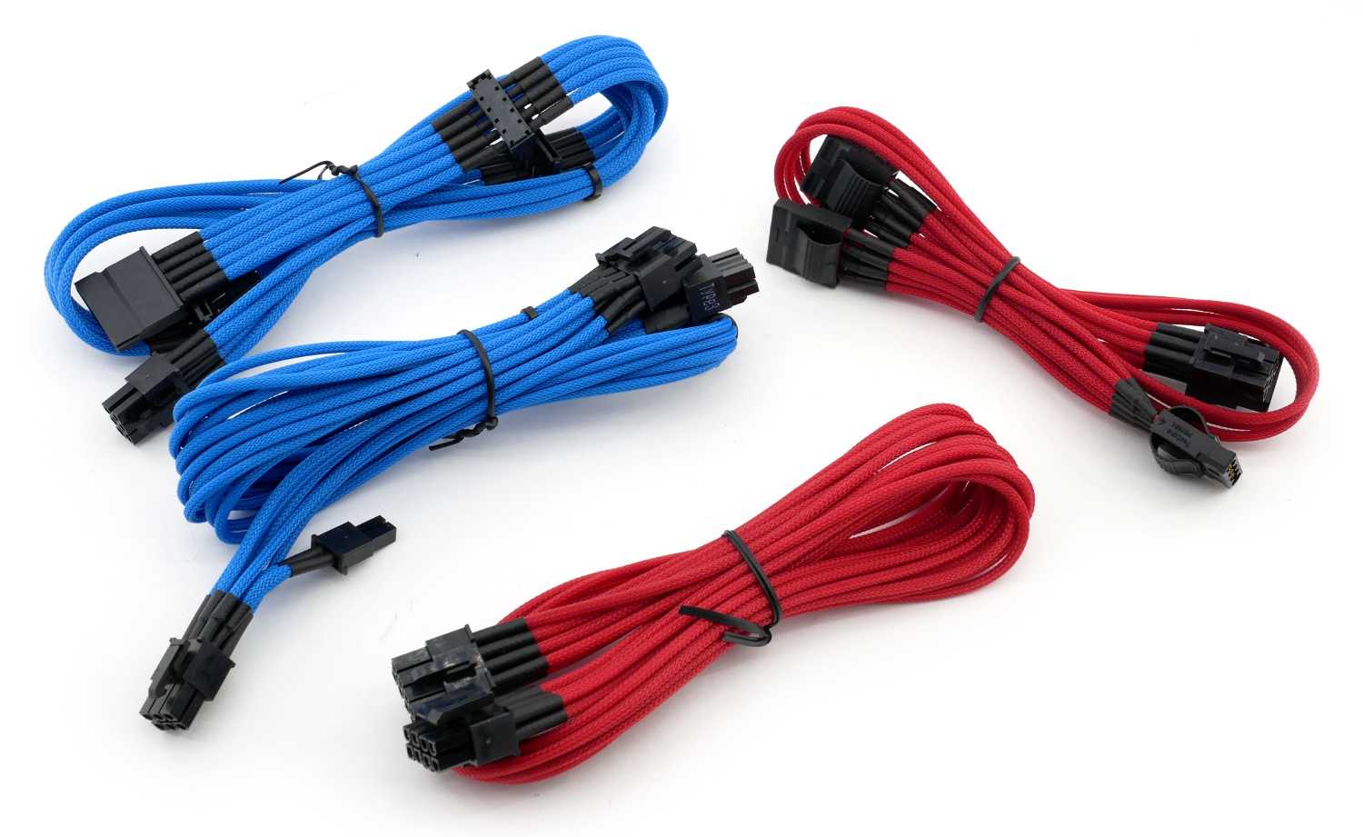 Провода получили фирменную нейлоновую оплетку черного цвета, жесткую, но прочную. Немного отступая от тематики обзора, в распоряжении компании Corsair имеются отдельный комплекты кабелей с индивидуальным оплетением и различной цветовой гаммой, например, красной и синей, которая используется нами в составе тестового стенда.