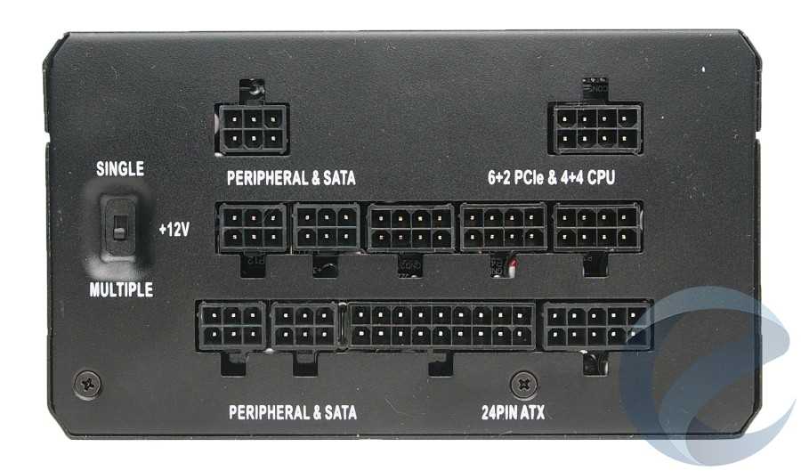 С внутреннего торца открывается вид на выходы для подключения кабелей. Конструкция блока питания полностью модульная. Блок имеет следующие слоты для подключения: