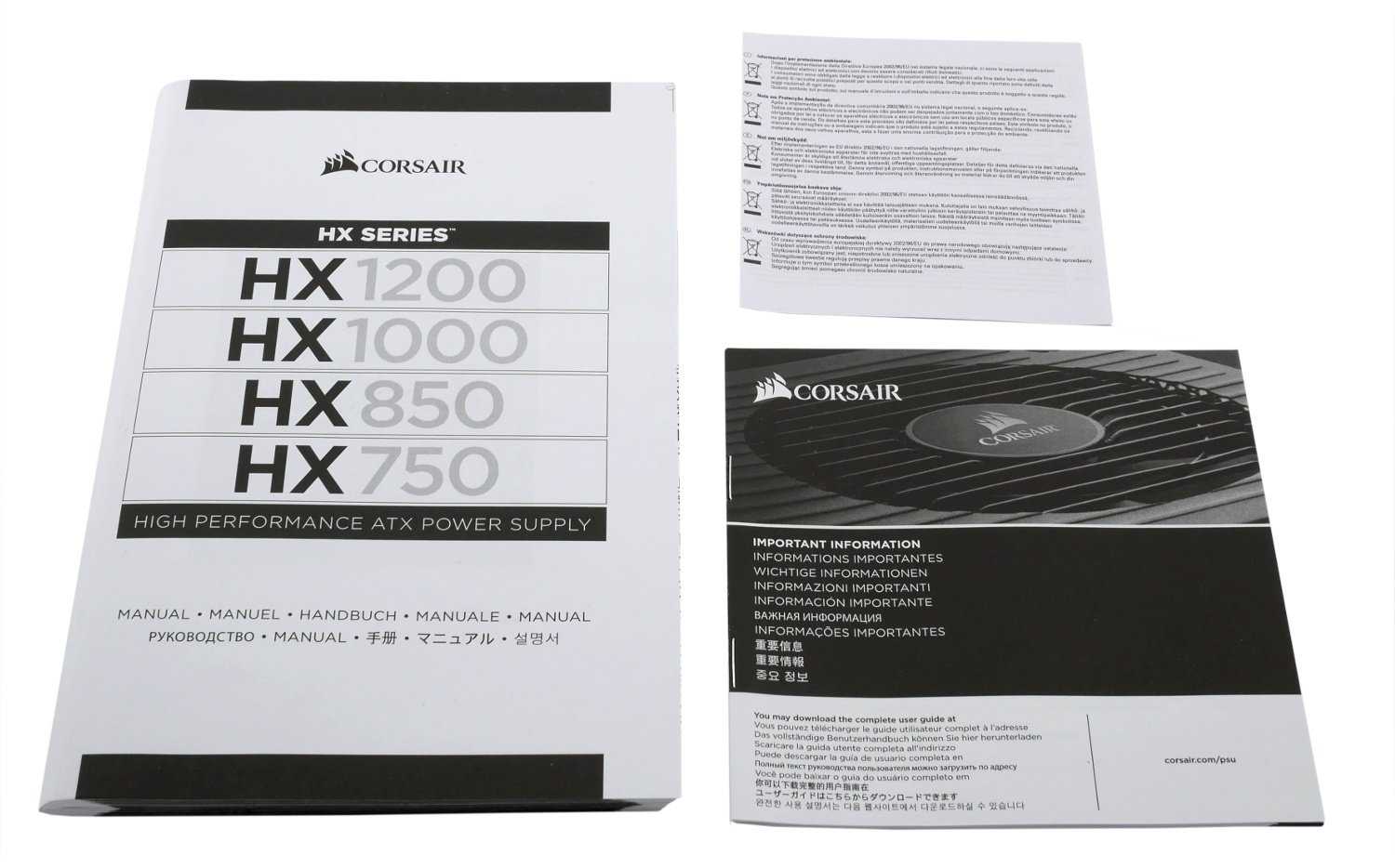 Бумажная составляющая комплектации включает руководство пользователя для всех моделей ряда Corsair HX мощностью 750-1200 Вт, гарантийный талон и памятку техники безопасности.