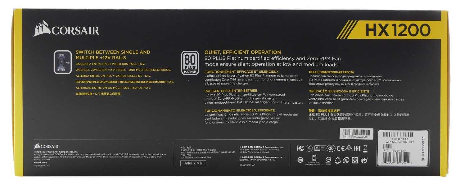 При заявленной мощности в 750Вт блок питания Corsair HX750 способен отдавать по линии 12В все 750Вт. Столь высокие показатели объясняются чрезвычайной эффективностью устройства, обладающего сертификатом 80 Plus Platinum.