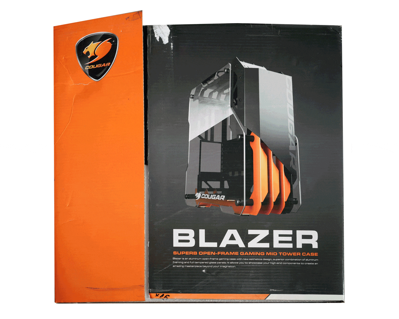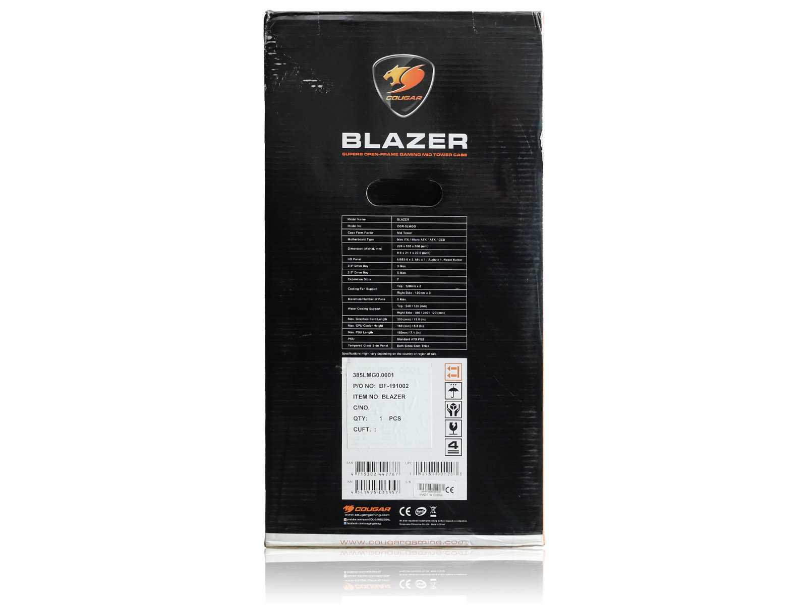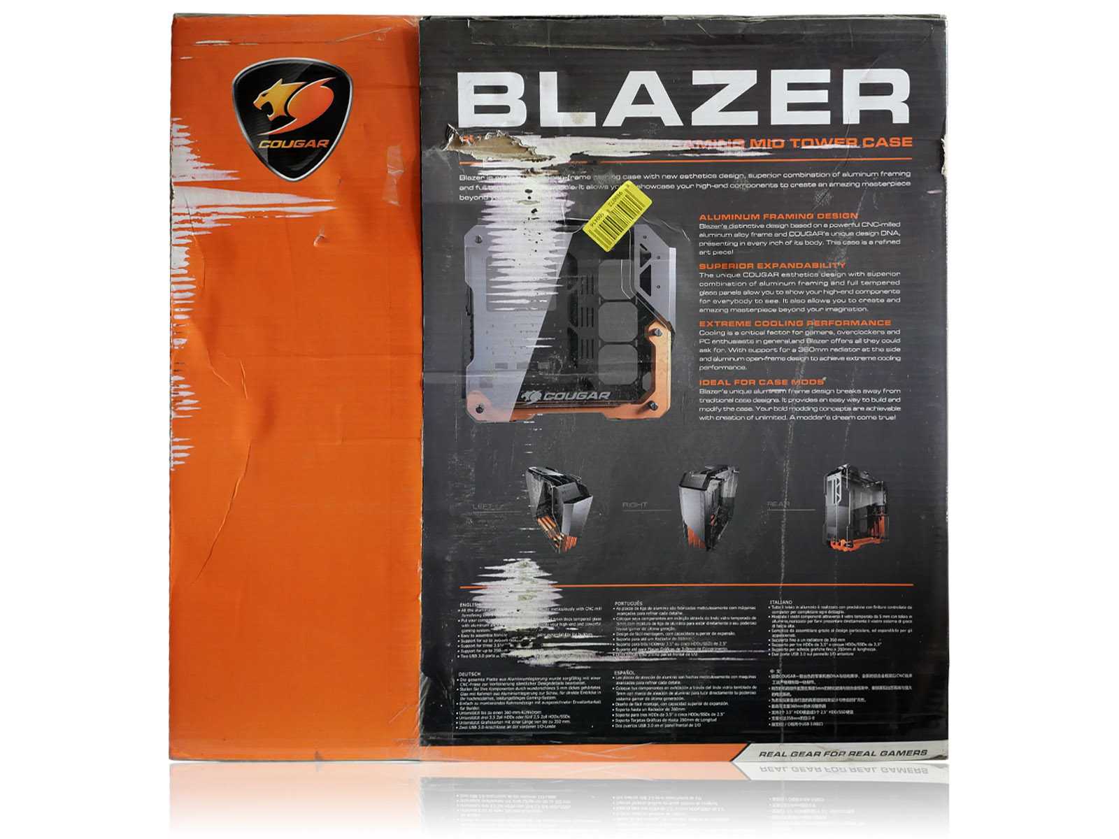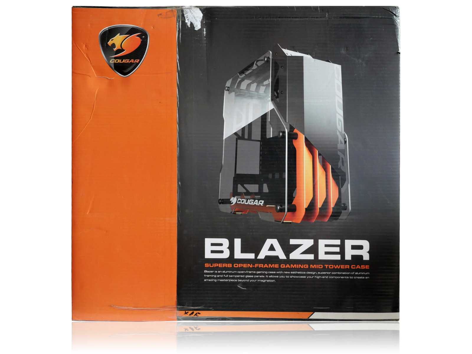 Крупная коробка с корпусом Cougar Blazer выполнена в яркой стилистике, заданной ещё первым «модником» с рамой открытого типа — Cougar Conquer. Габариты упаковки — 33 x 63 x 67 сантиметров. Оформление содержит табличку со спецификацией, а на задней части расписаны «фишки» корпуса, но, к сожалению, всё это только на иностранных языках.