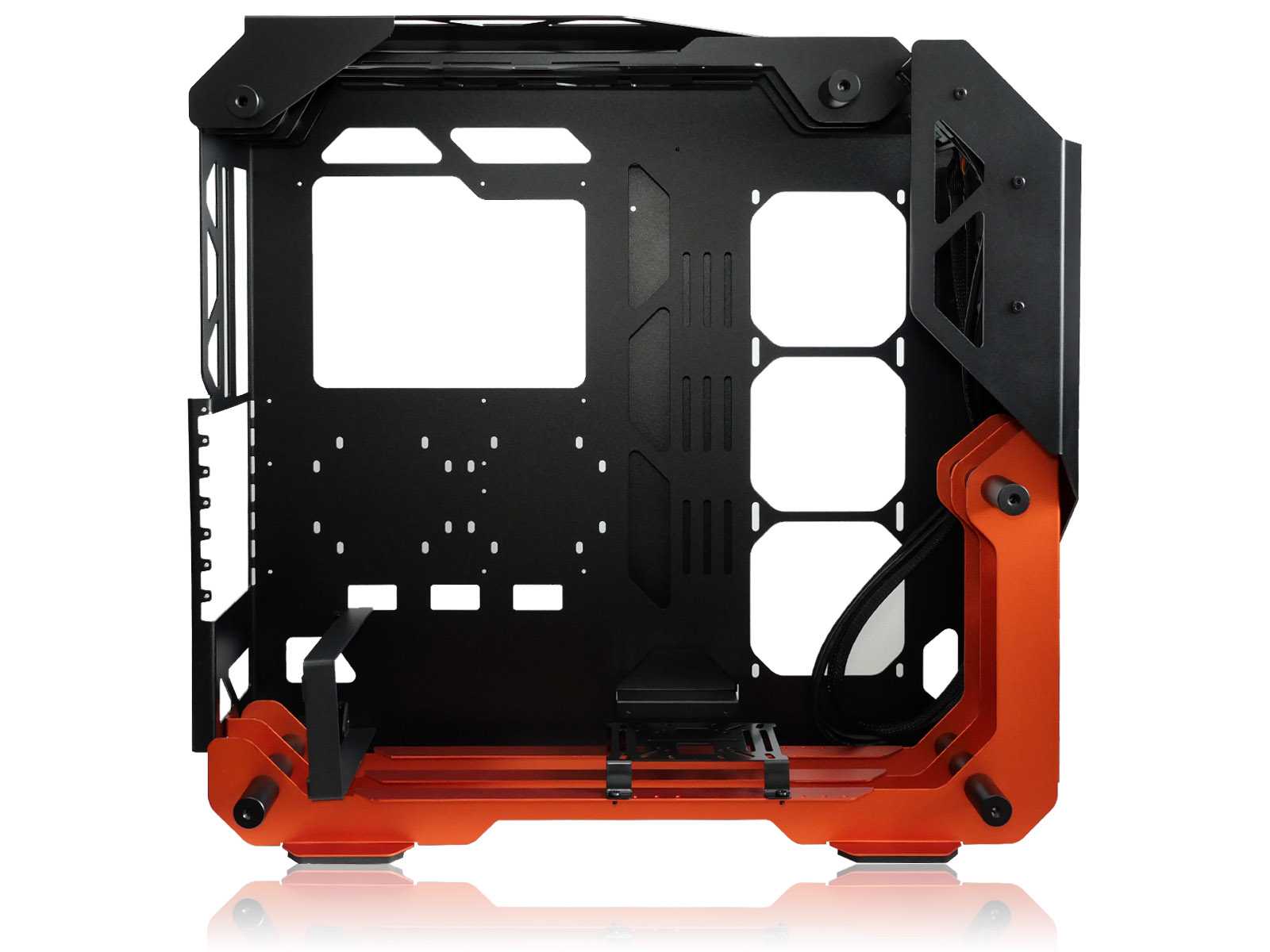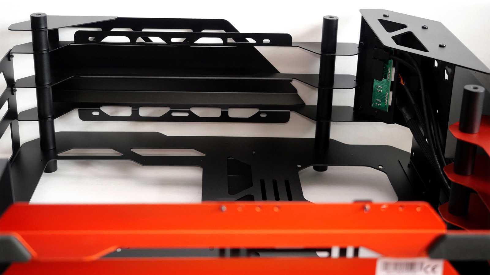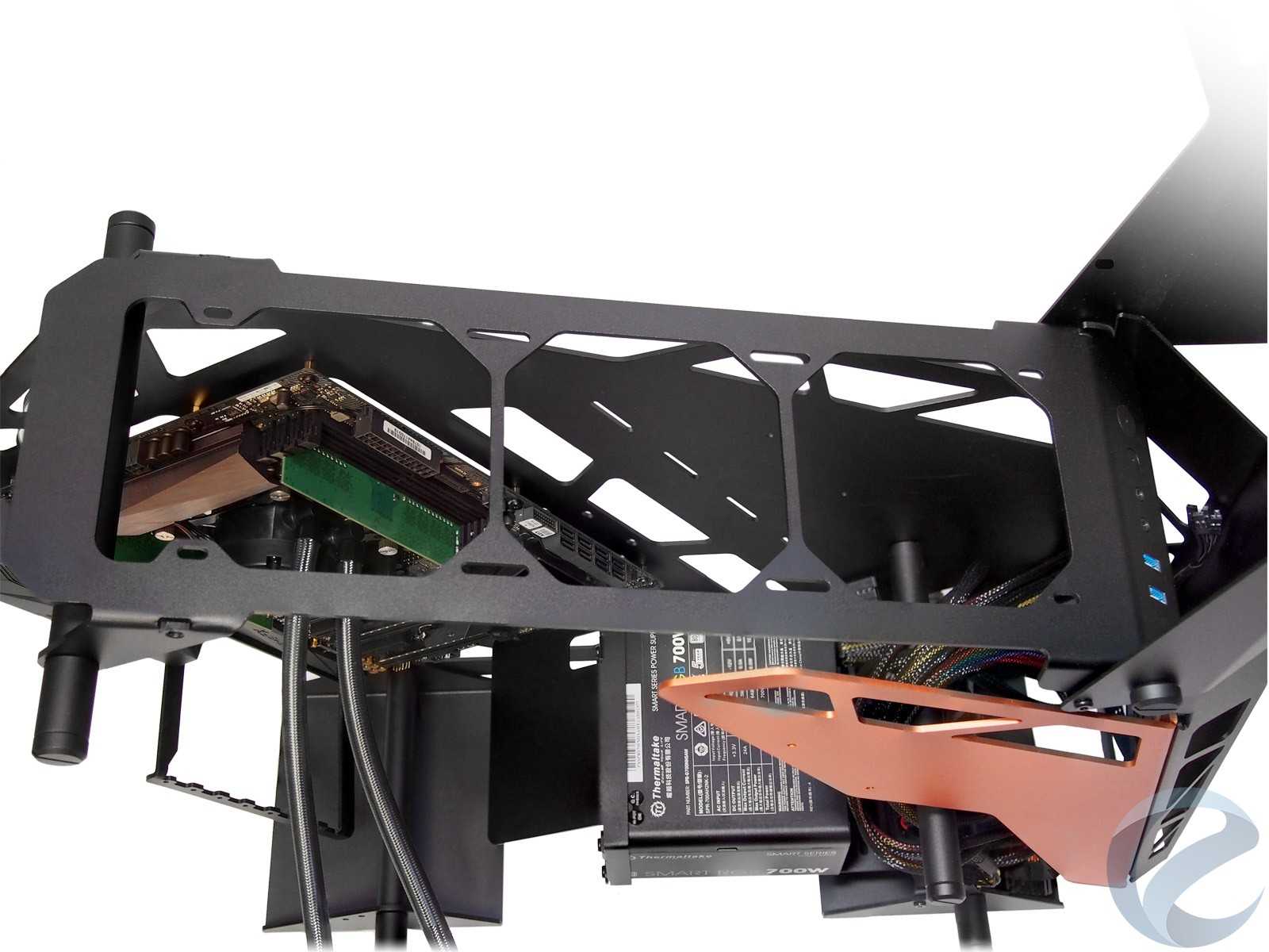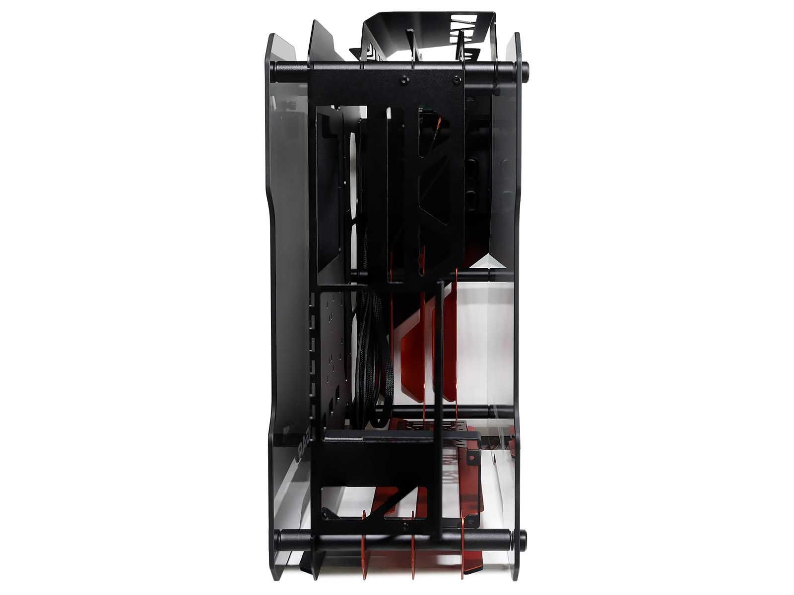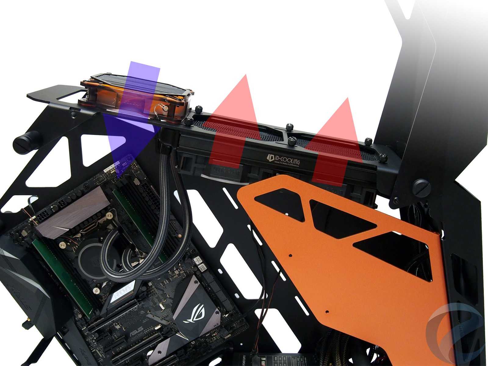 При всём ярком и впечатляющем наружном дизайне к внутренней организации пространства и типовым посадочным местам для комплектующих в любых корпусах предъявляются строгие требования, гарантирующие совместимость. Откинув декоративные элементы, по сути останется достаточно привычная компоновка шасси для корпуса с нижним расположением блока питания, с поправкой на отсутствие каких-либо внутренних перегородок, которые в open-frame исполнении теряют свой смысл.