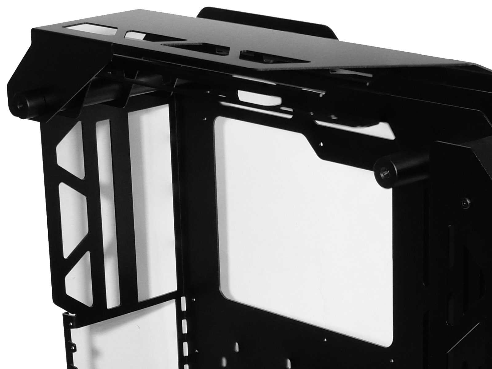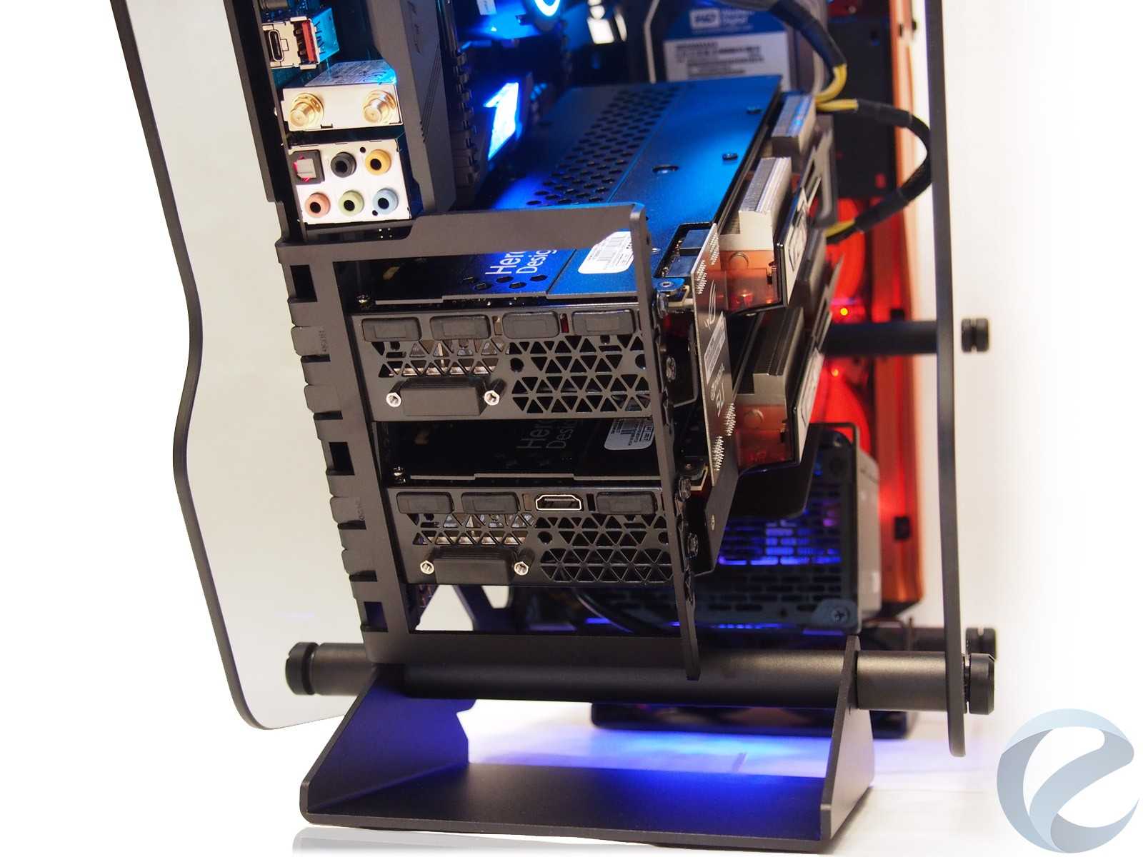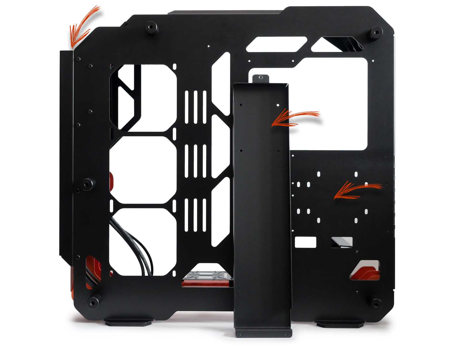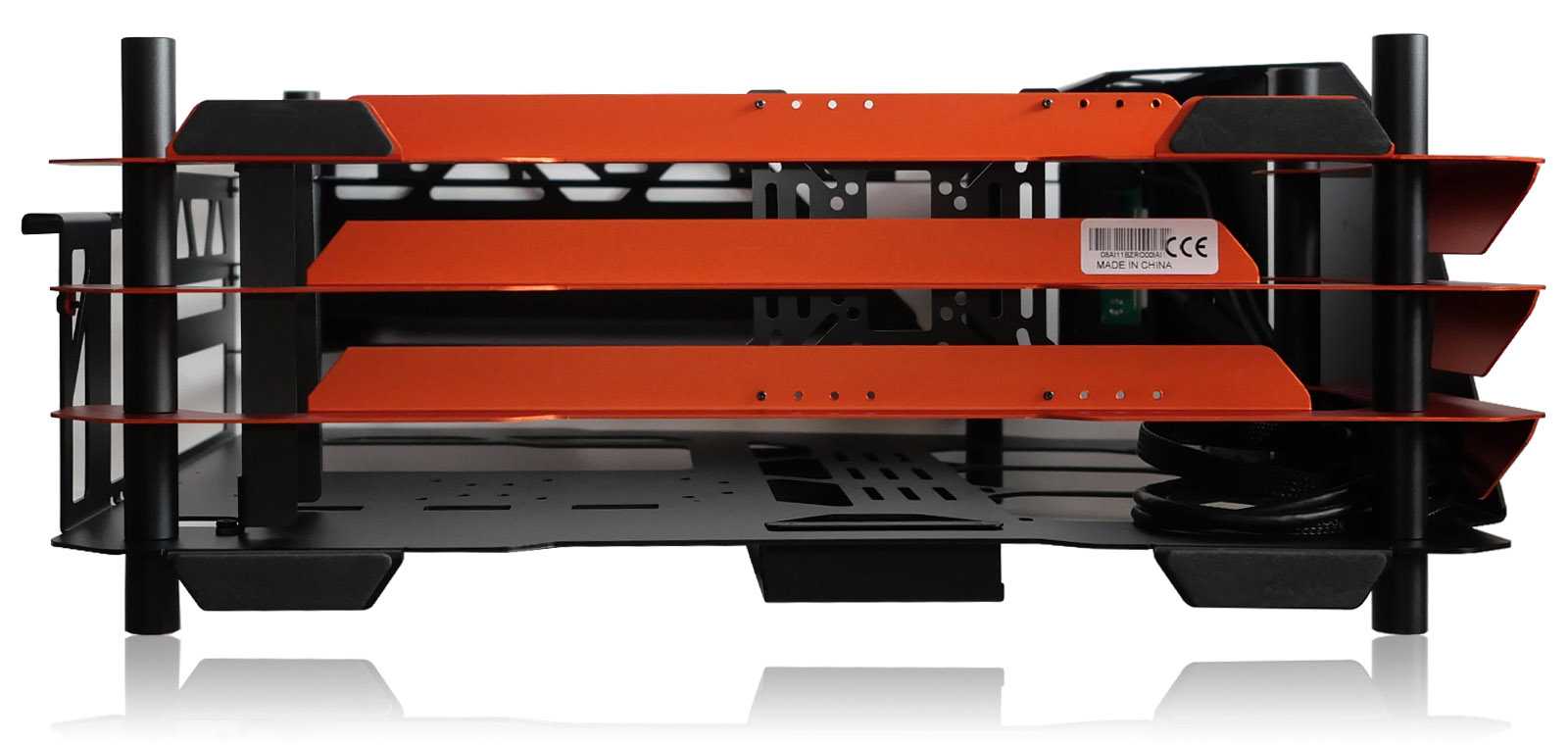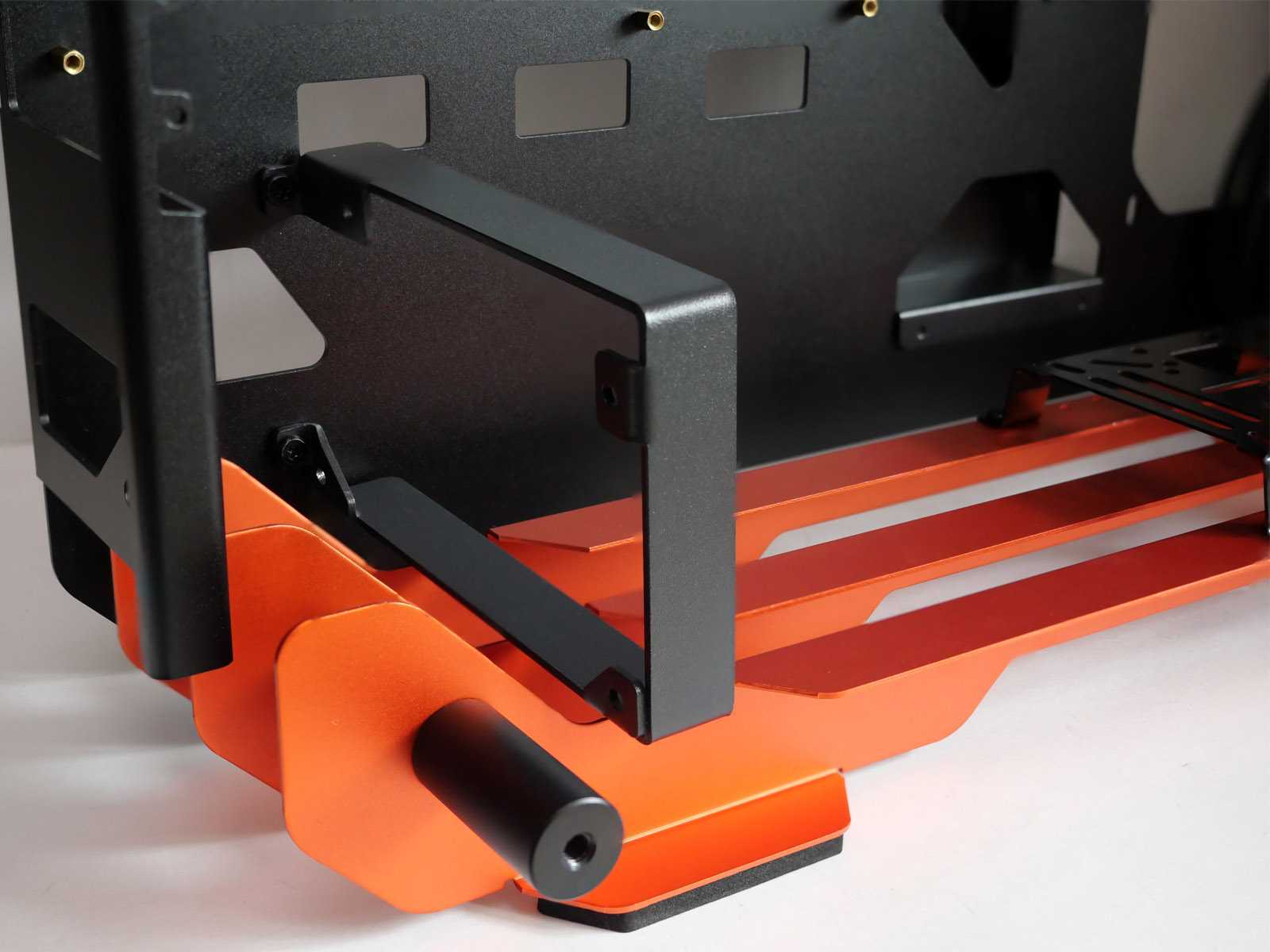 При всём ярком и впечатляющем наружном дизайне к внутренней организации пространства и типовым посадочным местам для комплектующих в любых корпусах предъявляются строгие требования, гарантирующие совместимость. Откинув декоративные элементы, по сути останется достаточно привычная компоновка шасси для корпуса с нижним расположением блока питания, с поправкой на отсутствие каких-либо внутренних перегородок, которые в open-frame исполнении теряют свой смысл.