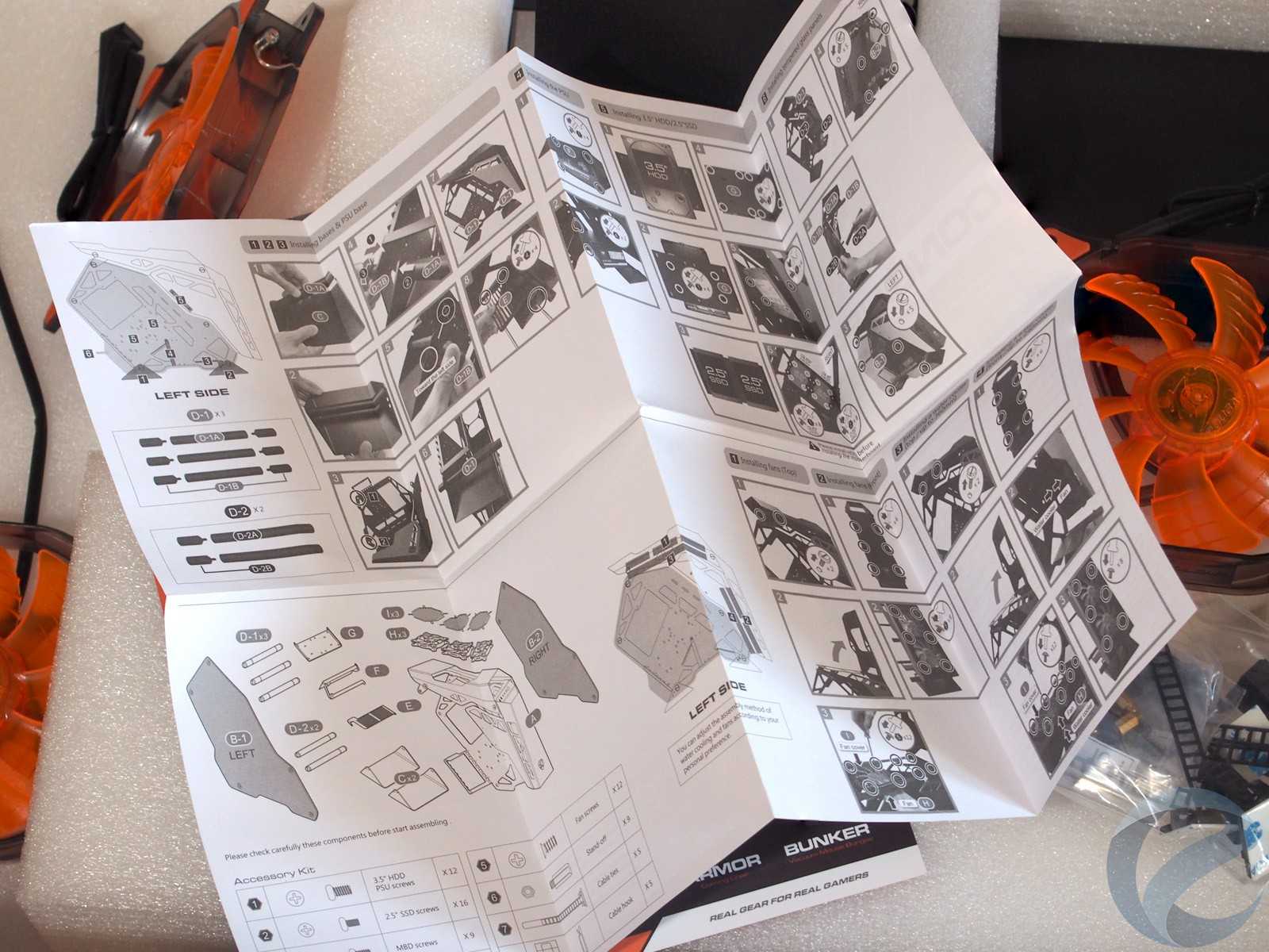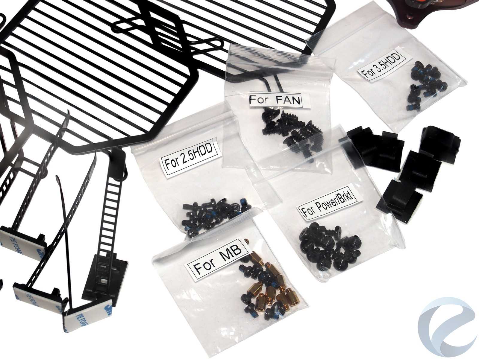 Инструкция укладывается в один лист сложенный «гармошкой». В этой части от недешевого корпуса ожидаешь красочно оформленный буклет. Правда, сборка настолько проста, что особо расписывать нечего. Недостаток внимания к премиум-позиционированию заметен и в части крепежных винтов. С одной стороны, их не поленились рассортировать в отдельные пакетики с надписями о предназначении для тех или иных комплектующих, с другой, не вложили спикер и инструмент для вкручивания винтов стоек креплений материнских плат, равно как и не окрасили последние в цвет корпуса.