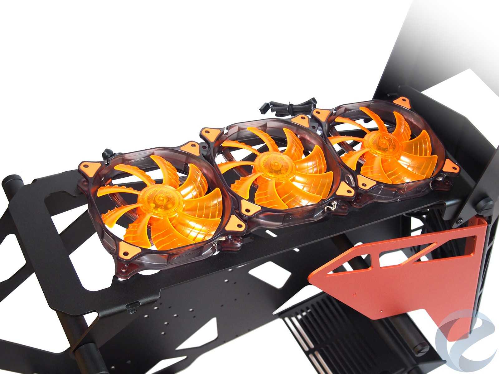 Открытая компоновка предрасполагает к использованию комплектующих с RGB-подсветкой. Жалко, что комплектные вентиляторы светятся только одним оранжевым цветом и не сопрягаются с распространенной в топовых комплектующих подсветкой типа AURA.