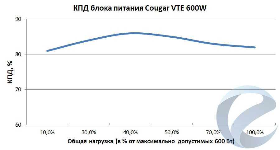 Согласно значку на упаковке, блок питания Cougar STE 600W был проверен на соответствие стандарту энергоэффективности 80PLUS Bronze. Однако на сайте Plug Load Solutions, где выкладываются результаты сертификации, упоминания об этом нет в сводной таблице. По собственным замерам в ходе тестов средний КПД составил около 83%, а пик достиг значения 86% при общей нагрузке в районе 40% мощности.