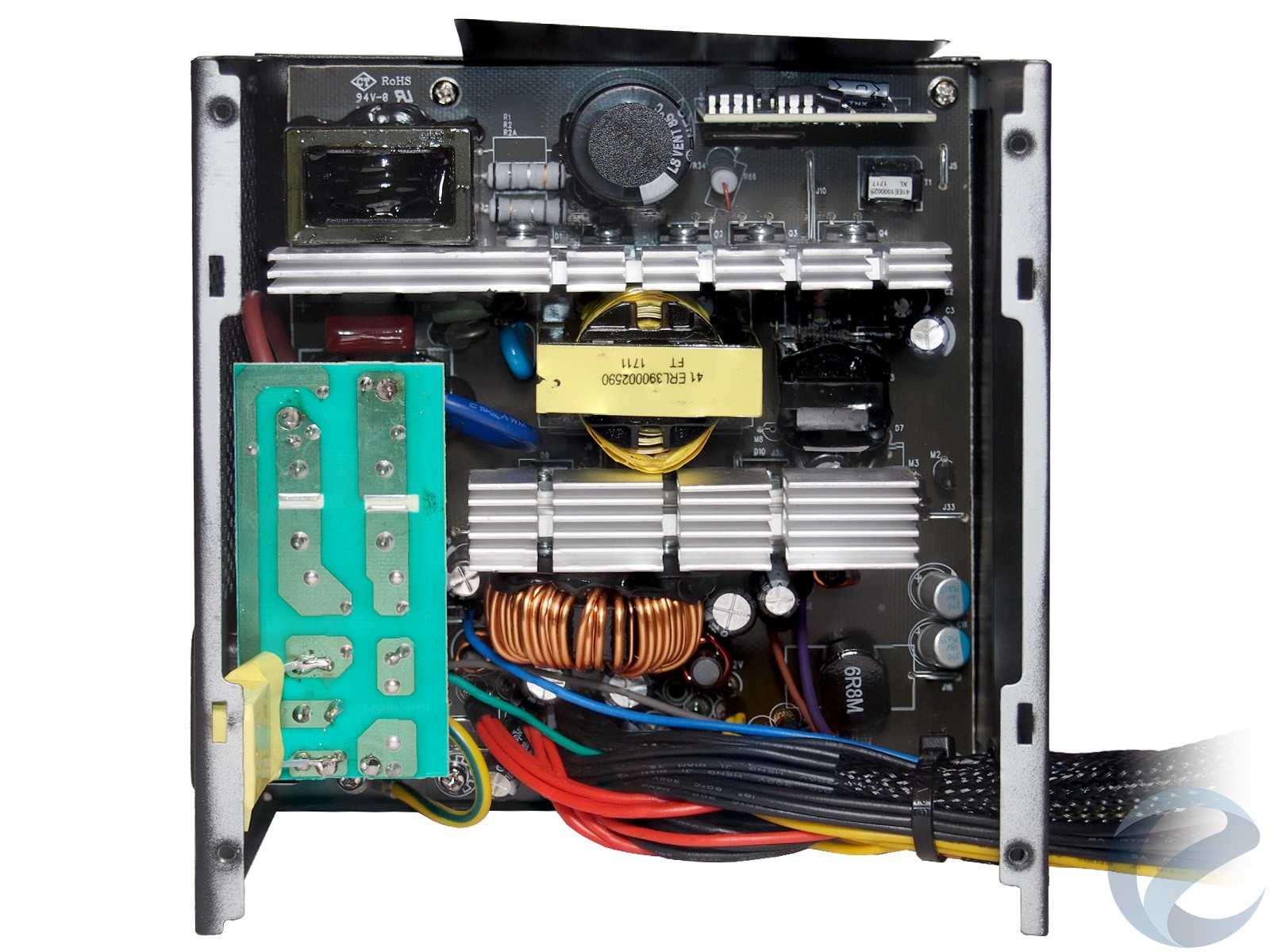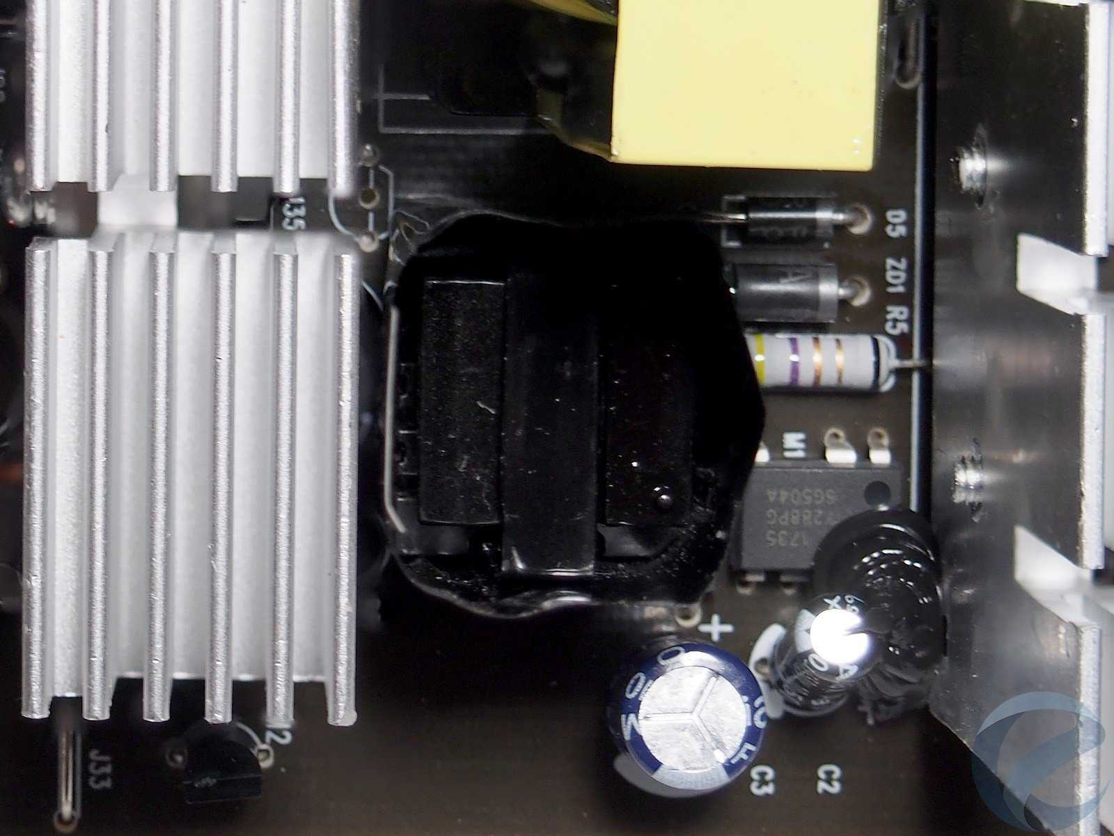 Внутри блока питания относительно свободное размещение силовых компонентов. В глаза бросаются два достаточно крупных радиаторас увеличенной площадью оребрения в верхней части, вокруг которых и сгруппированы большинство транзисторов и диодных сборок.
