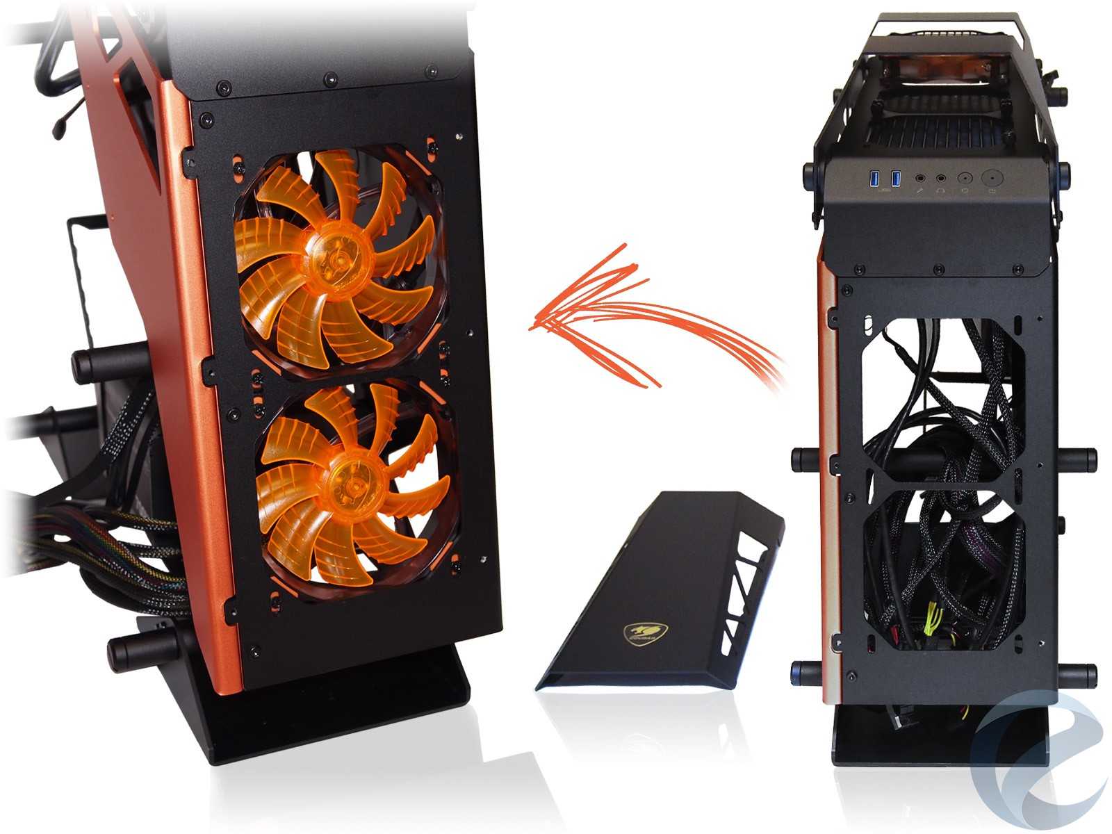 Несмотря на компоновку Cougar Conquer как полуоткрытой системы с обилием отверстий для хорошей вентиляции, в современном игровом ПК обойтись без серьезных систем охлаждения невозможно. Для этих целей на корпусе вверху предусмотрены посадочные места для трех 120 мм вентиляторов в верхней части, которые также могут использоваться для установки 120/240/360 мм радиатора системы жидкостного охлаждения. С задней стороны присутствует и продолговатый вырез, позволяющий провести шланги внутрь корпуса в случае размещения радиатора СЖО непосредственно под верхней откидной крышкой. Стоит учесть, что высоты доступного места между каркасом корпуса и крышкой не хватит для установки радиатора с установленными вентиляторами «снаружи», что-то одно нужно будет крепить с внутренней стороны корпуса.