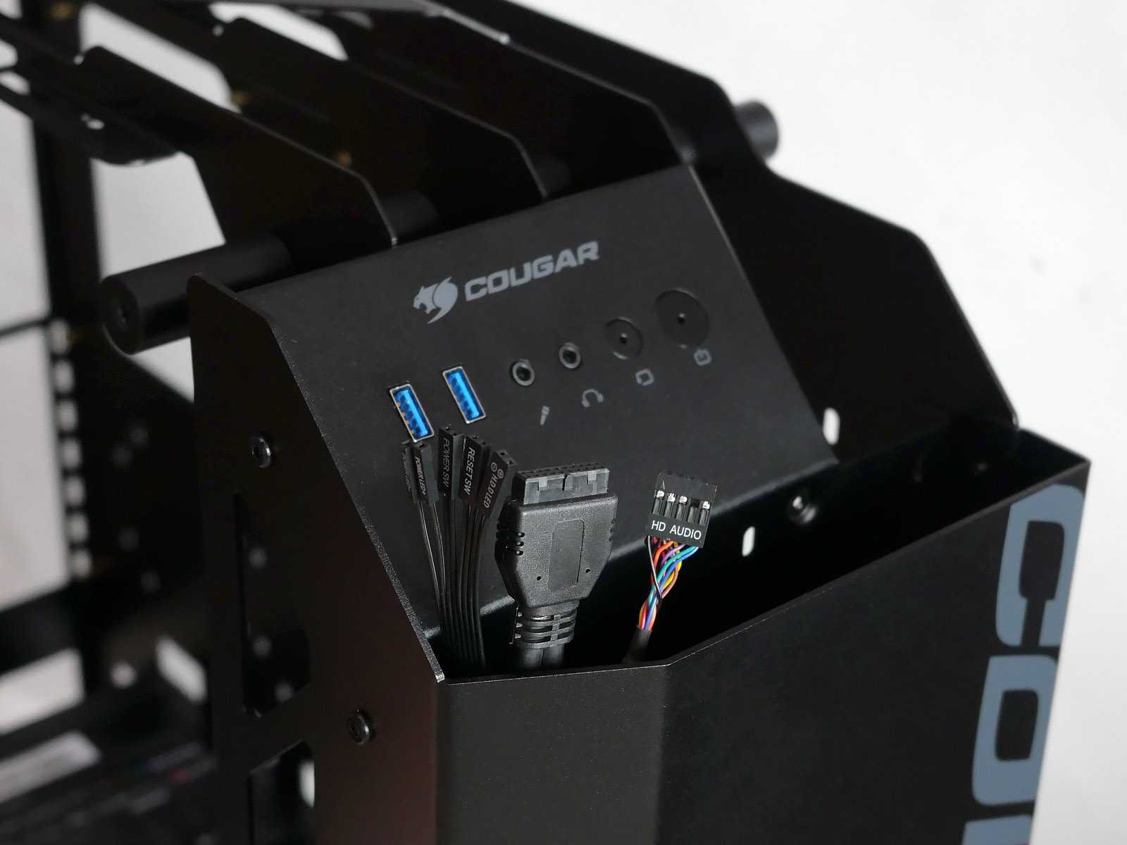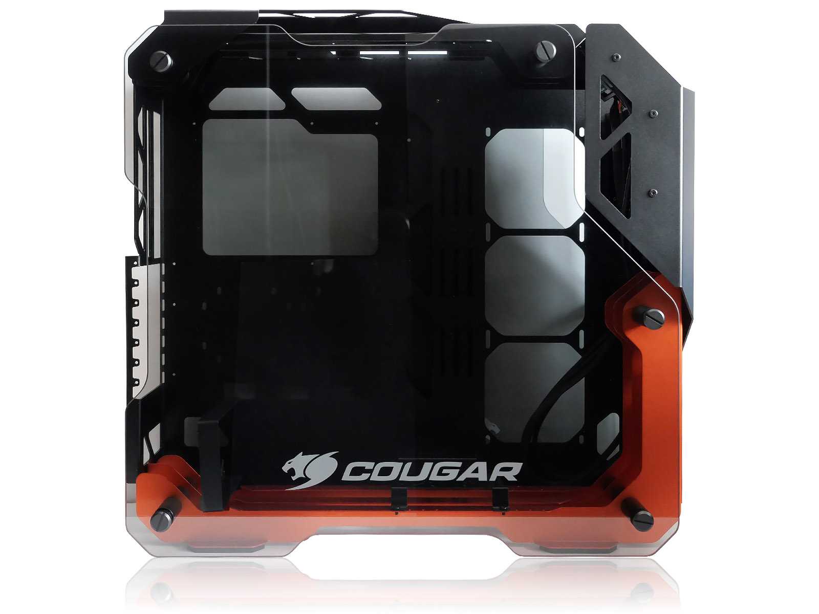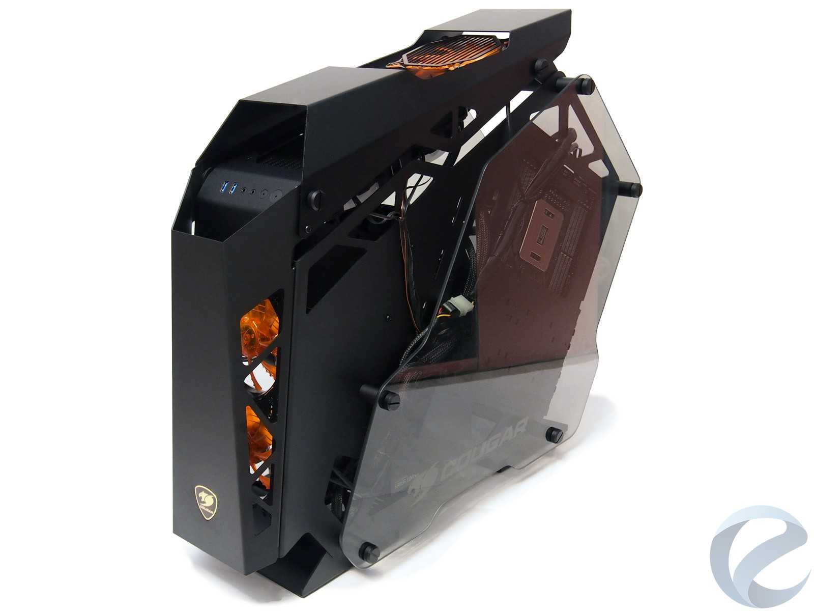 Несущий каркас корпуса и все силовые соединительные элементы выполнены из толстого металла от 1,5 до 2 мм толщиной с надёжными цилиндрическими соединителями. На этом Cougar в своих премиальных корпусах не экономит. Равно как и применена стойкая к истиранию порошковая матовая окраска. Благодаря использованию дизайна с большим количеством изящных рёбер жёсткости, а не глухих панелей, общий вес корпуса получился не слишком большим.