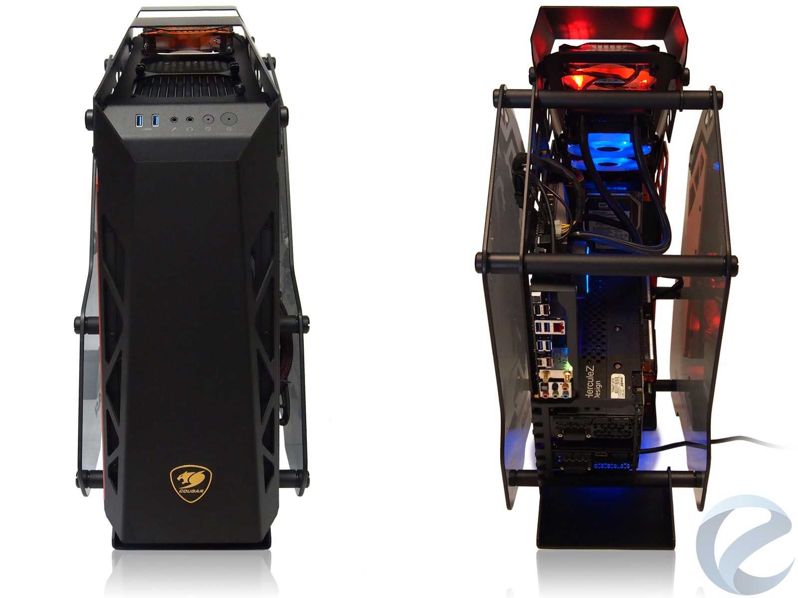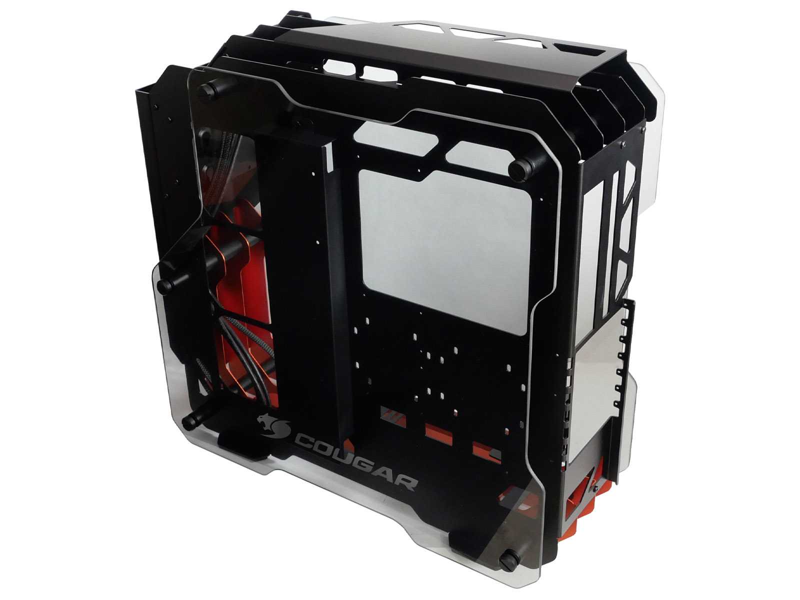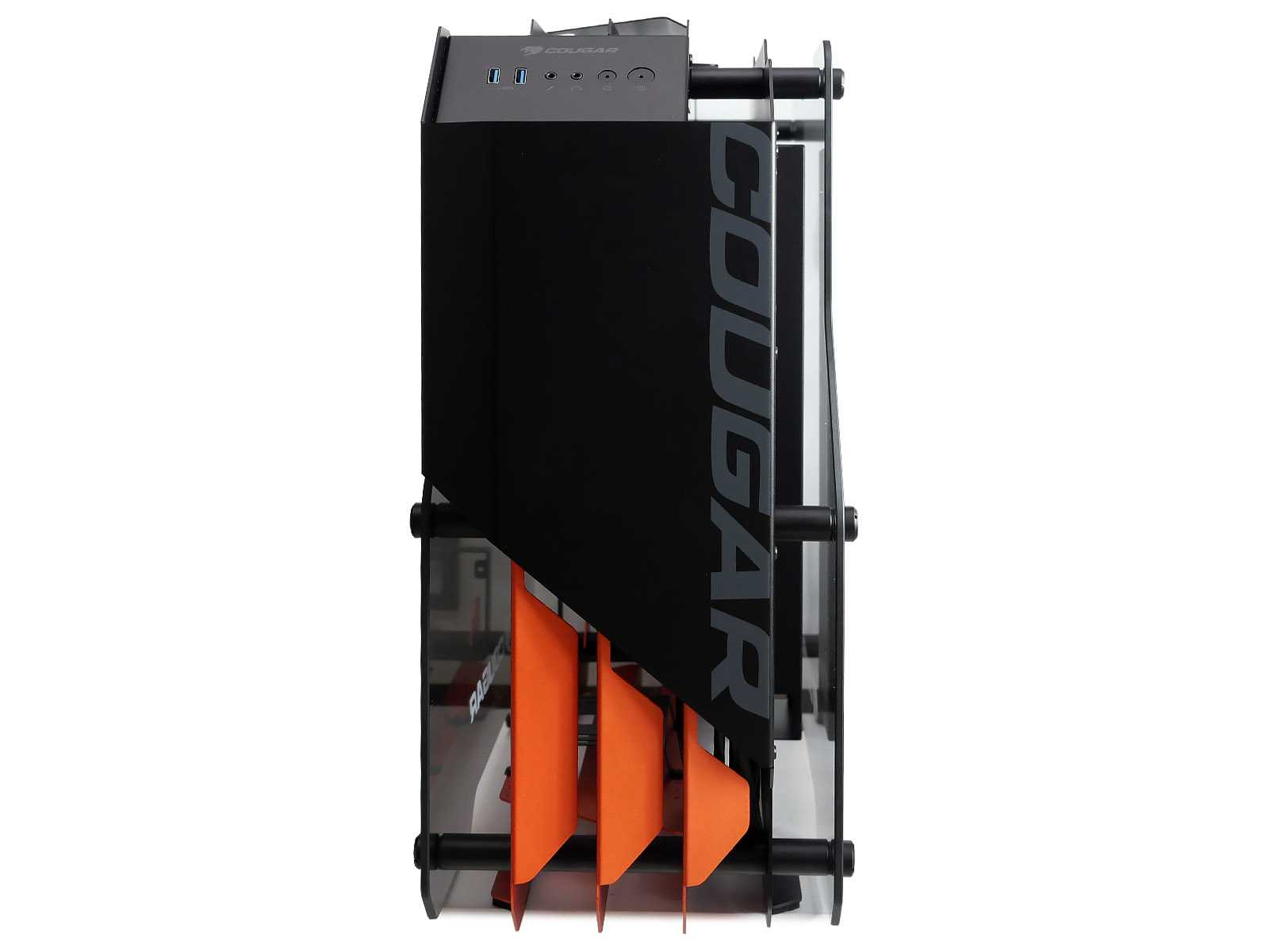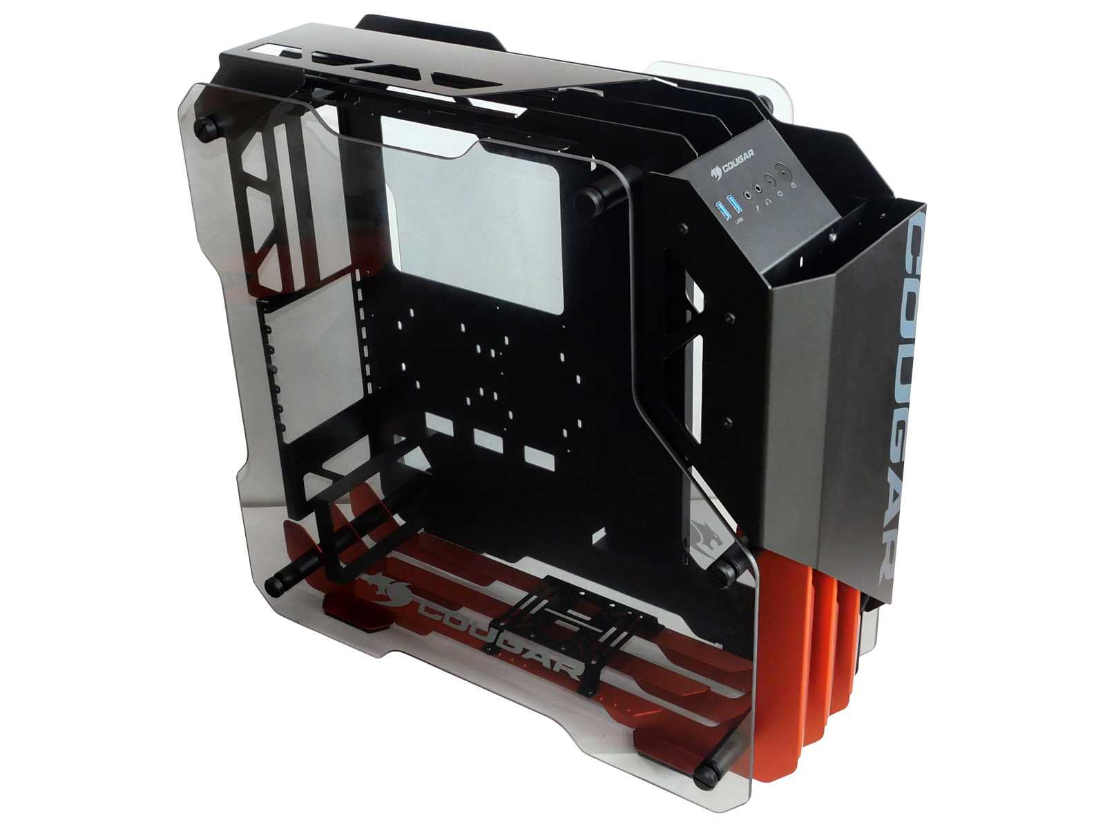 Несущий каркас корпуса и все силовые соединительные элементы выполнены из толстого металла от 1,5 до 2 мм толщиной с надёжными цилиндрическими соединителями. На этом Cougar в своих премиальных корпусах не экономит. Равно как и применена стойкая к истиранию порошковая матовая окраска. Благодаря использованию дизайна с большим количеством изящных рёбер жёсткости, а не глухих панелей, общий вес корпуса получился не слишком большим.
