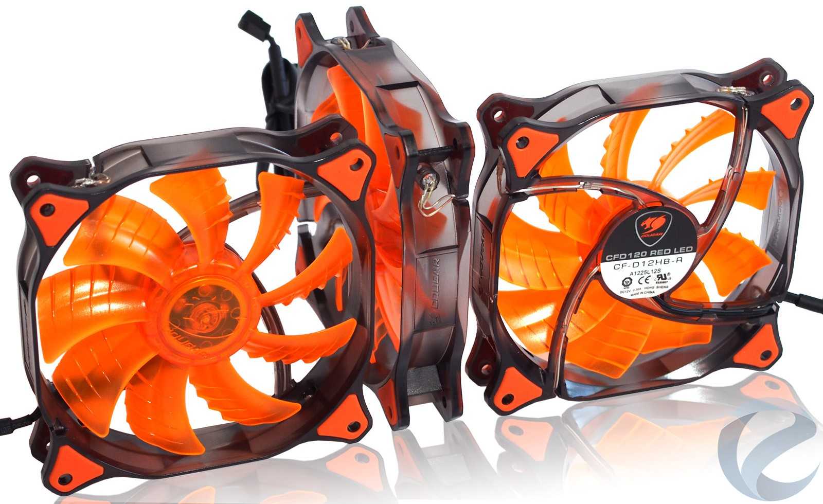С корпусом в комплекте идут неплохие вентиляторы COUGAR CFD 120 RED LED (заводская модель CF-D12HB-R или A1225L12S) с подсветкой среднего между красным и оранжевым цвета. Паспортные характеристики: напряжение питания — 12 В, потребляемый ток — до 0.3 А, скорость вращения — до 1200 оборотов в минуту.
