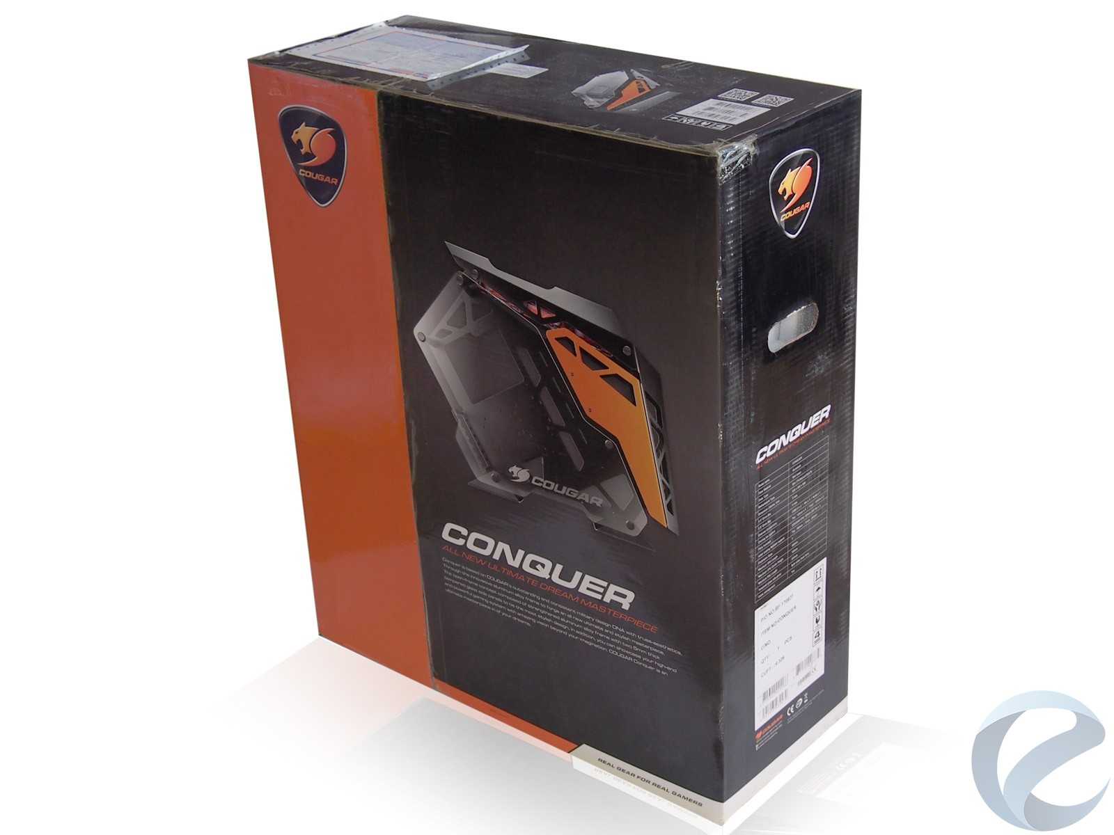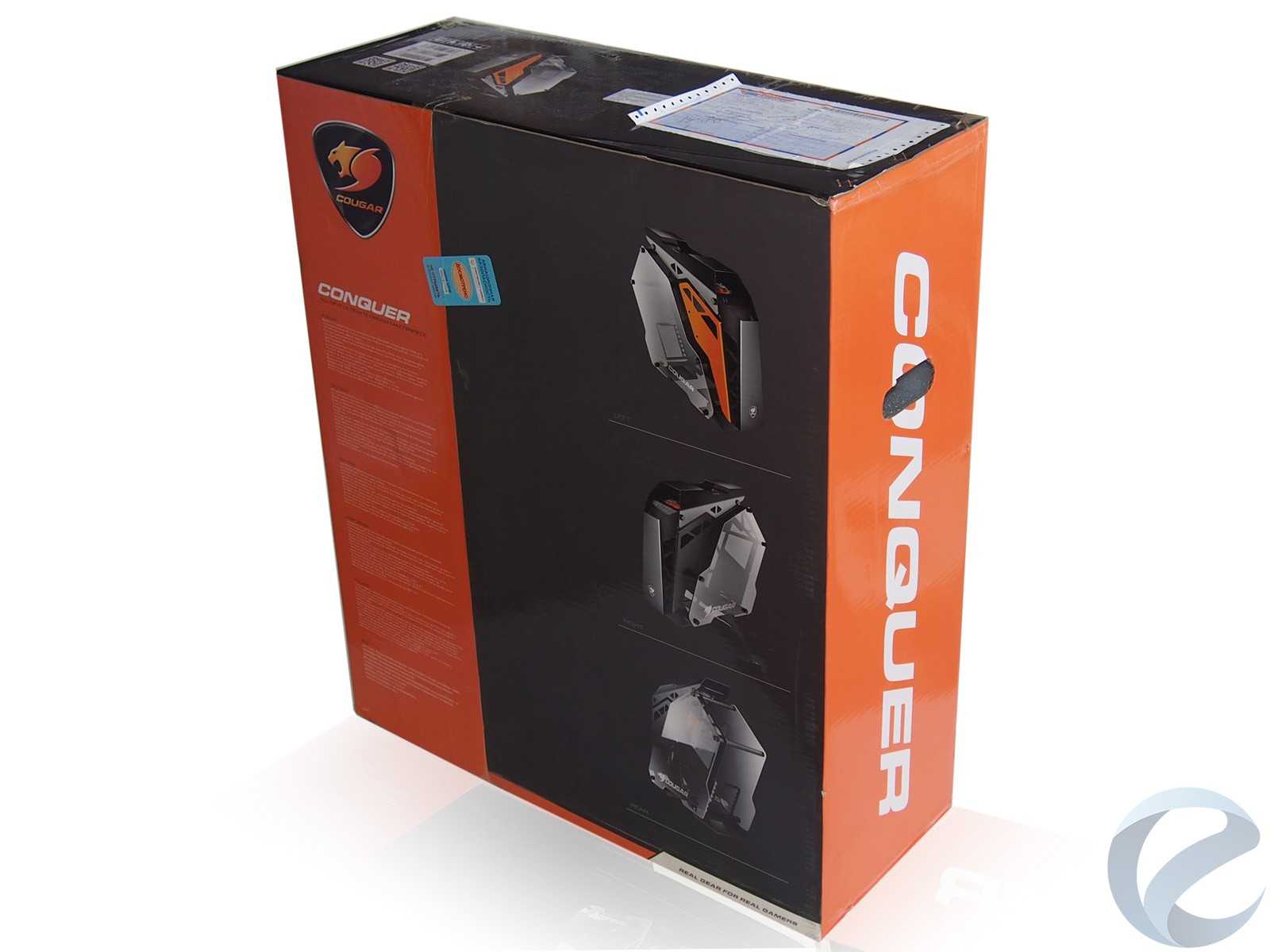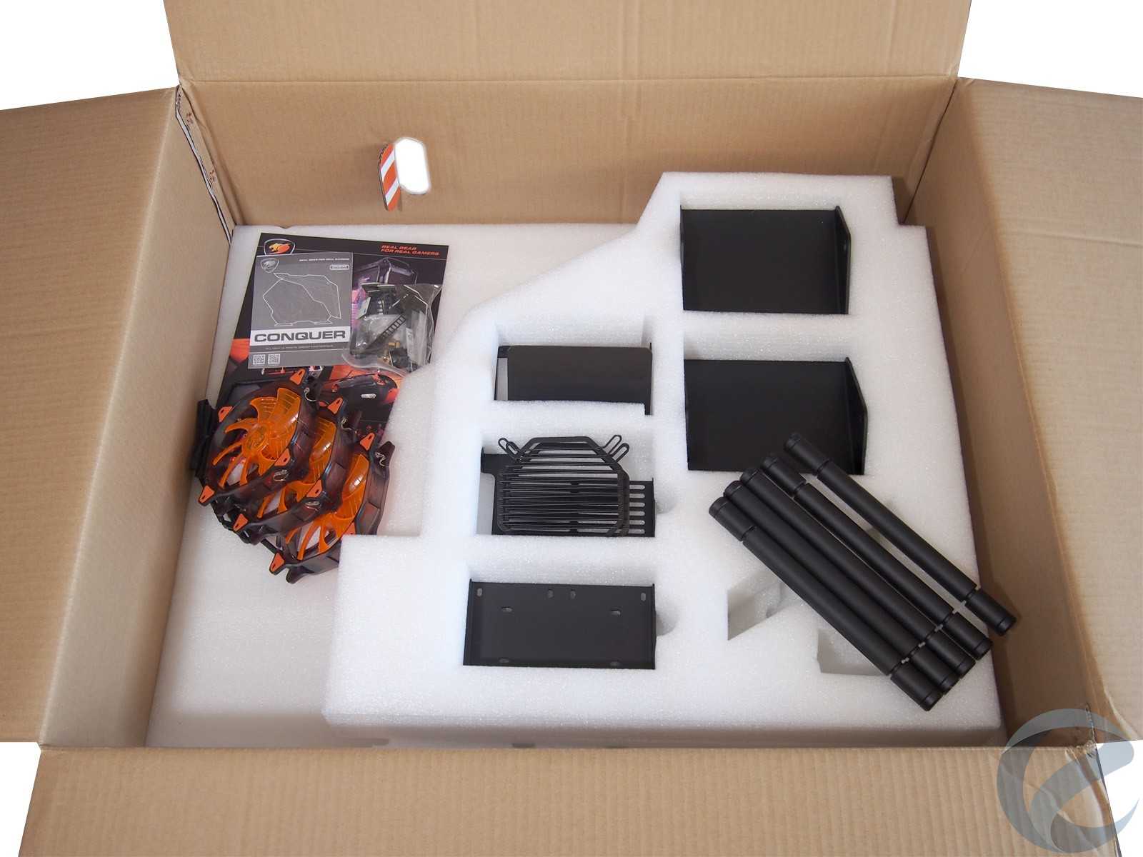 Коробка с COUGAR Conquer нетипично вытянута вверх и при этом относительно узкая. Связано это с тем, что корпус идет в разобранном виде и уложен с применением объемных уплотнителей, во избежание повреждения стеклянных или деформации металлических поверхностей.