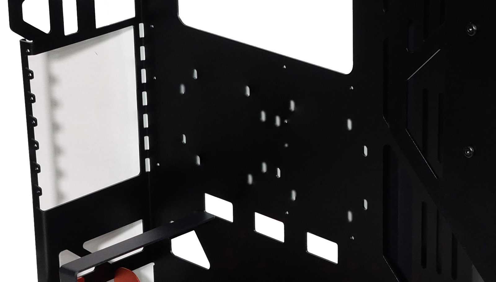 Поддон для установки материнской платы имеет заготовленные отверстия под форматы: Mini-ITX, MicroATX, ATX, CEB. Однако «ножки» в них необходимо вкрутить самостоятельно. Для портов задней интерфейсной панели материнской платы предусмотрена рамка, что эстетически смотрится изящнее, чем это было реализовано на Cougar Conquer первого поколения. Оптимальным вариантом будет материнская плата с несъёмной заглушкой и декоративным пластиковым кожухом над ней.
