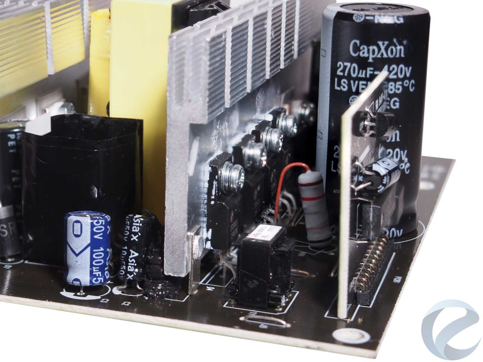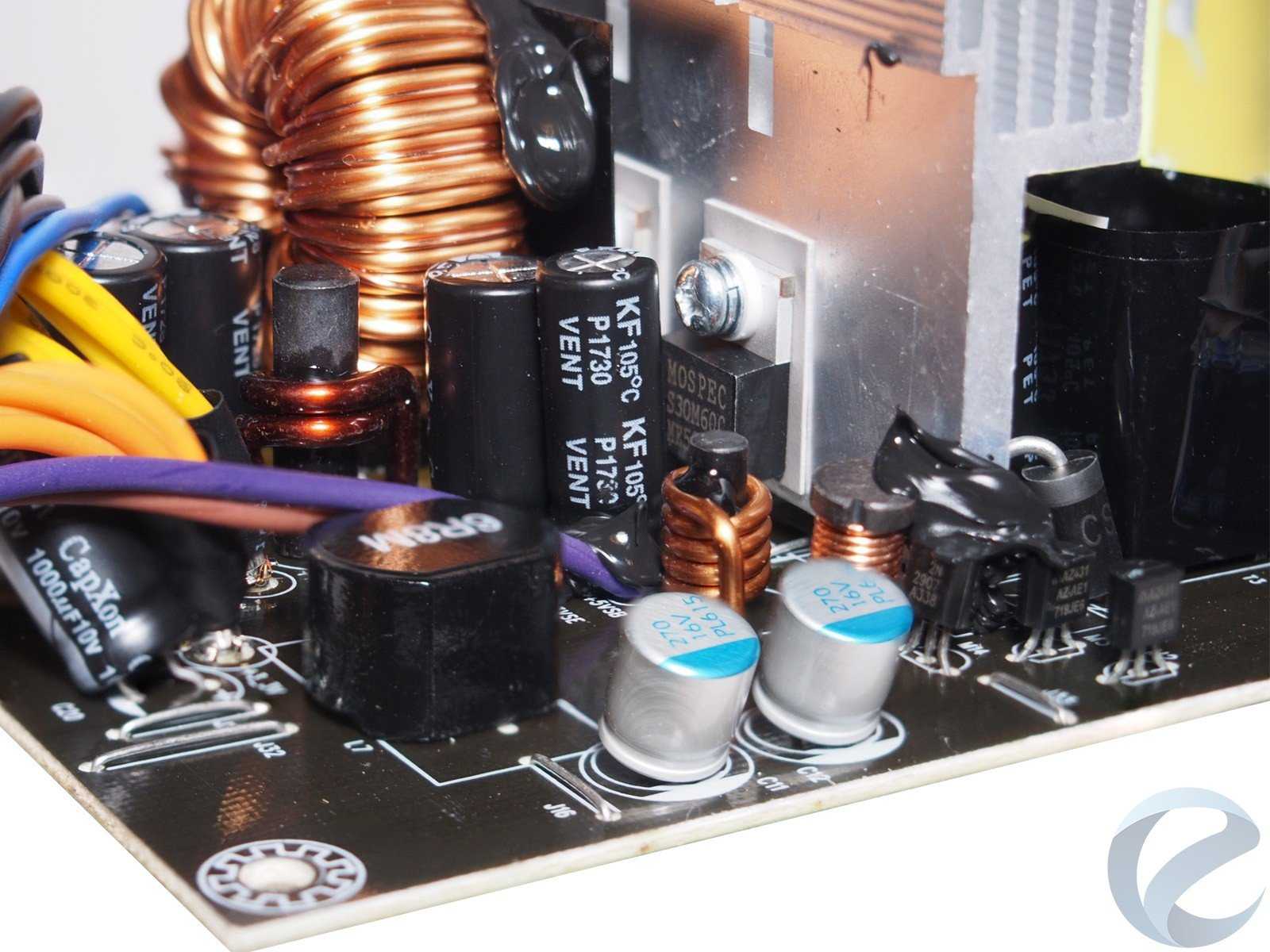 Фильтрующие конденсаторы выходных напряжений — CapXon серии KF с рабочей температурой до 105 градусов Цельсия. В нескольких частях платывстречаются и твердотельные конденсаторы.