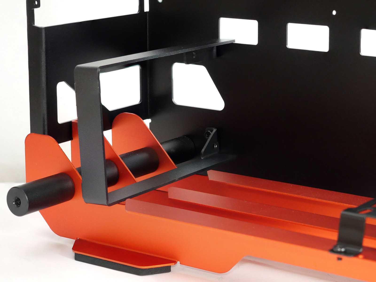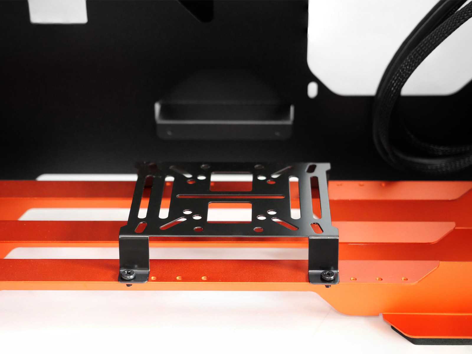 Для крепления блока питания используется рамка, которая держится на двух винтах. Дополнительную поддержку снизу блоку обеспечат оранжевые направляющие на дне корпуса.