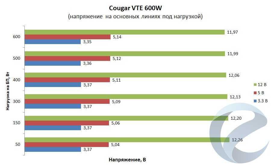 Максимальная мощность Cougar VTE 600W — 600 Вт, при этом заявлено, что блок питания способен выдать мощность по линии +12 В до 540 Вт, а в совокупности по +3,3 В и +5 В — до 150 Вт.
