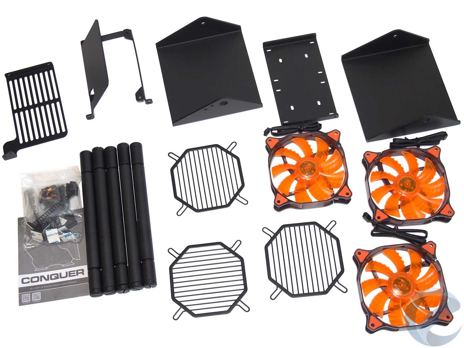 Серьезным сюрпризом стал и тот факт, что стандартных удлиненных винтов, которые обычно идут в комплекте с дополнительными вентиляторами и системами жидкостного охлаждения, не хватает для сквозного крепления «бутерброда» по схеме (снизу-вверх) «радиатор СЖО<->стенка корпуса<->вентилятор<->защитная решетка». Сказывается толщина прочного металлического каркаса Cougar Conquer, который почти на 2 мм толще среднестатистической стенки в обычных корпусах. Поэтому при использовании жидкостного охлаждения будет два пути: искать в магазинах винты большей длины или ставить по схеме (снизу-вверх) «вентилятор<->радиатор СЖО<->стенка корпуса».