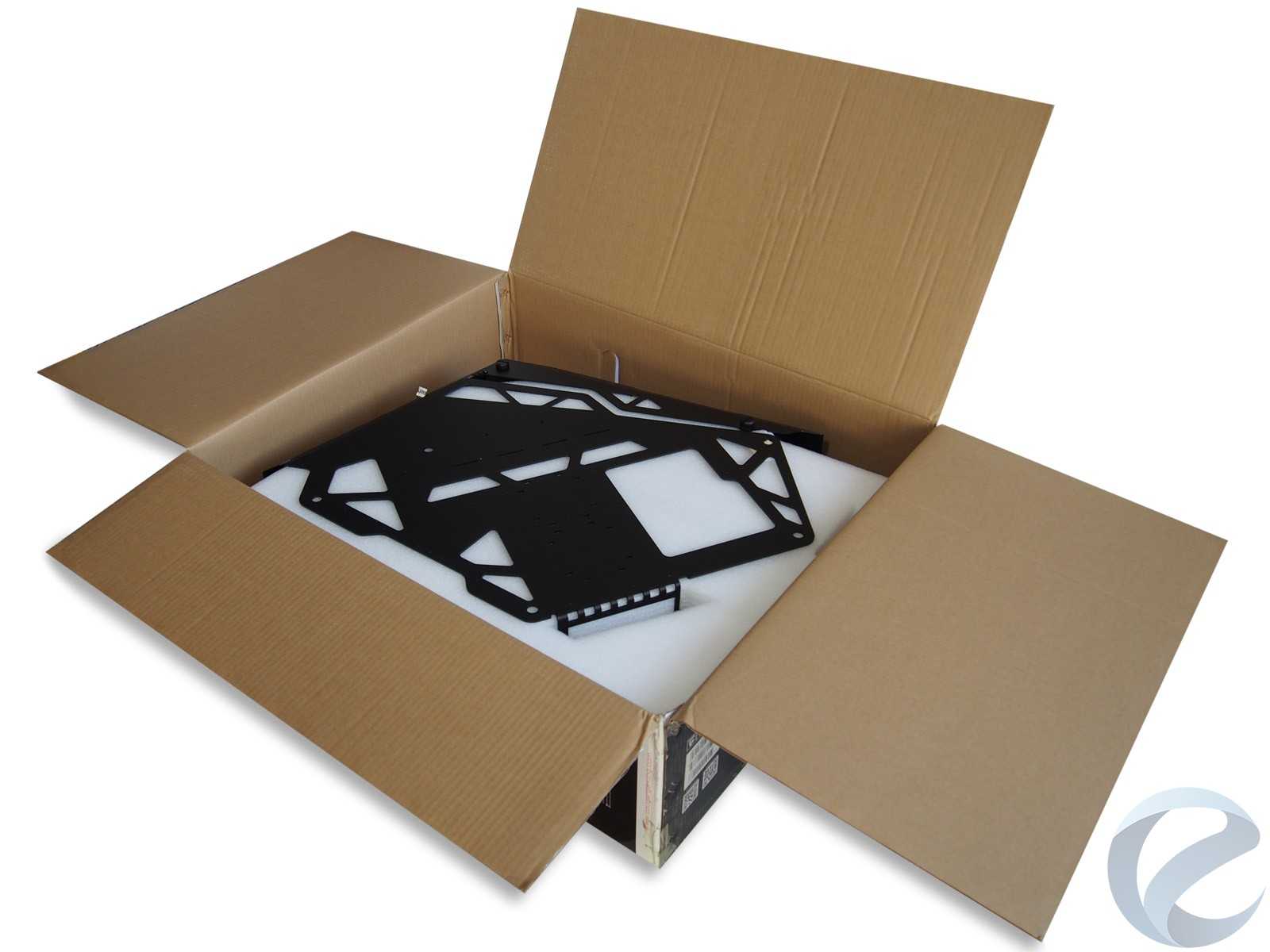 На боковых гранях сделаны вырезы — ручки. Внутри отдельные детали разложены послойно с надёжной фиксацией во вспененном материале, усиленном слоями картона. Упаковка достаточно плотная и в нашем случае с честью выдержала неаккуратное отношение экспедиторских компаний.