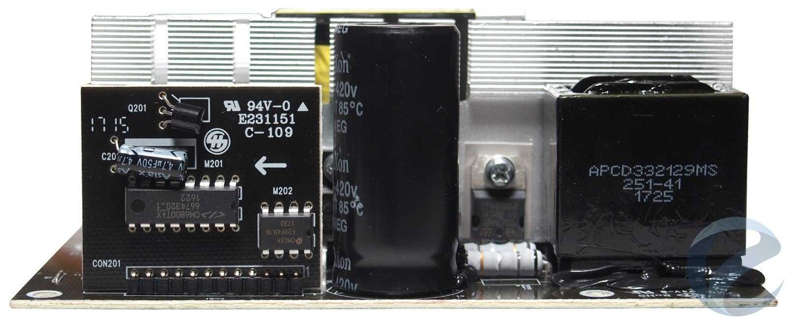 Источник дежурного напряжения построен на распространенной микросхеме TNY288PG, рядом в цепи используются электролитические конденсаторы Asia’X, рассчитанные на температуру до 105 градусов Цельсия, что немаловажно для работы в «stand-by» режиме, когда охлаждения вентилятором нет.