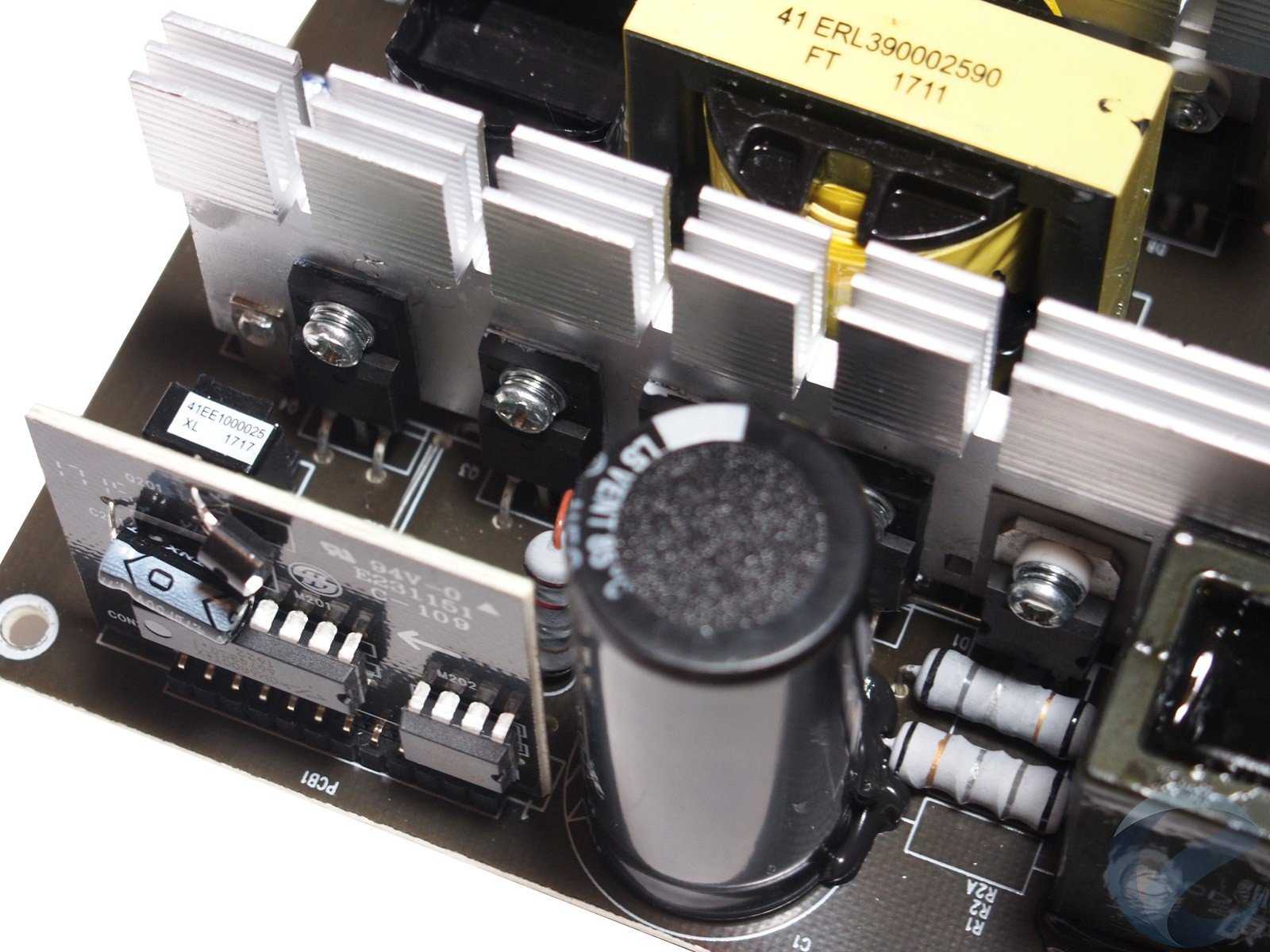 Контроллер преобразователя и корректора мощности на основе микросхемы CM6800TX вынесен рядом на отдельную вертикальную плату. На ней же микросхема CM03X, которая размыкает некоторые цепи при отключении APFC, чтобы уменьшить разрядный ток высоковольтного электролитического конденсатора, что облегчает повторный запуск БП при небольших простоях. Это особенно актуально на новых материнских платах с чипсетами Intel, где первичная инициализация UEFI BIOS при смене комплектующих или при определенных этапах настройки происходит в два этапа.