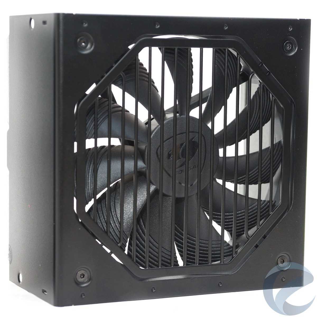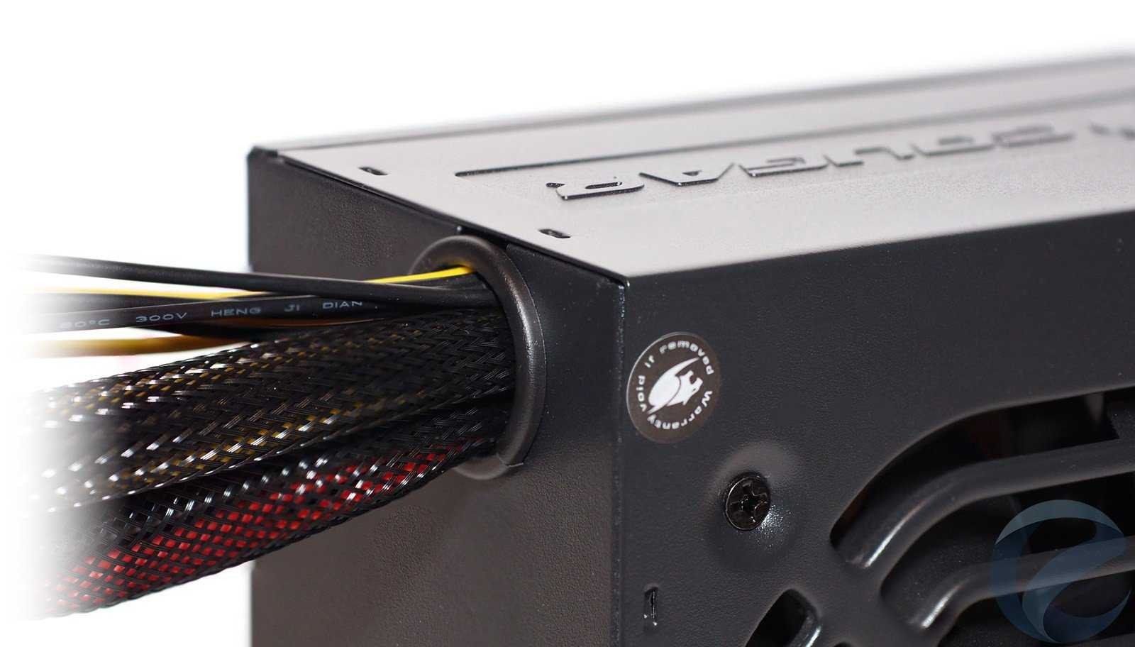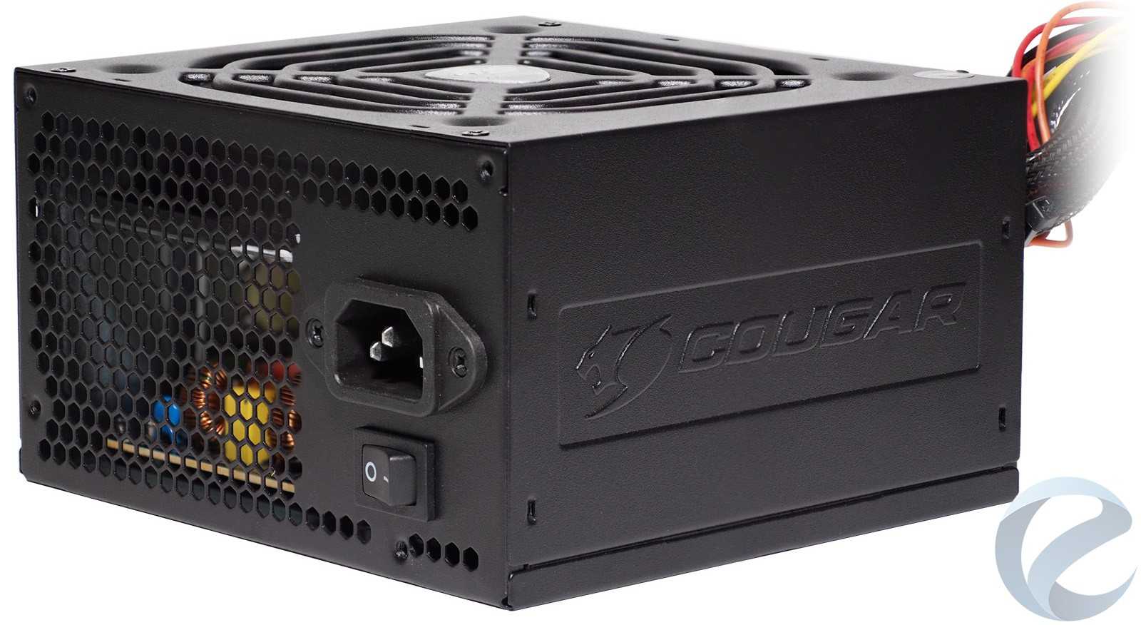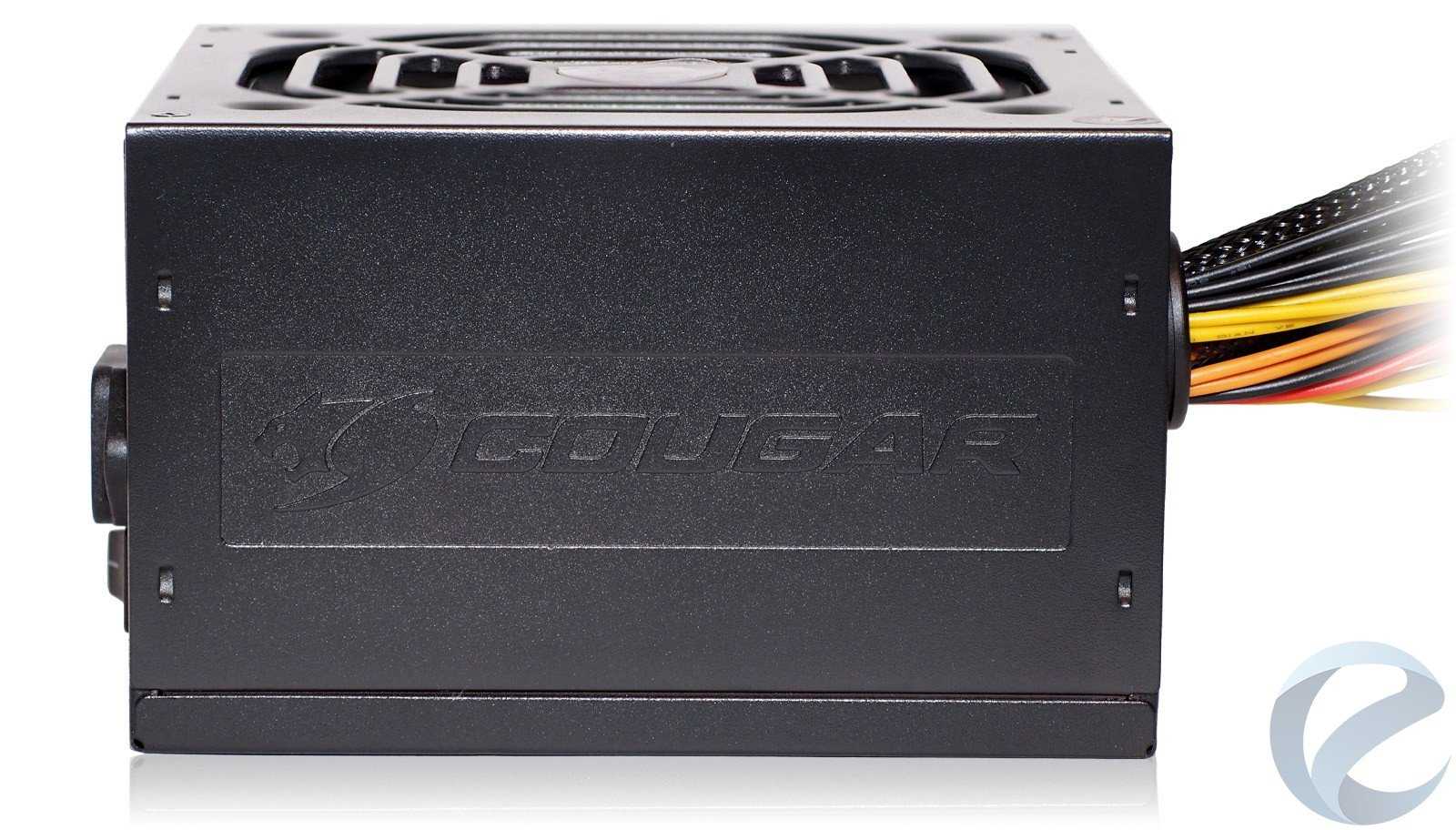 Дизайн воздухозаборной решетки узнаваем и стал визитной карточкой блоков питания Cougar, и, конечно же, в центре приклеен симпатичный шильдик с пумой. Боковые стороны отведены под наклейку со спецификацией и крупный выдавленный в металле логотип производителя. Качество сборки и материалы корпуса — без нареканий. Отличная подгонка деталей, равномерная окраска в матовый черный цвет и хорошая толщина металла дают первичное ощущение, что в руках качественное изделие.