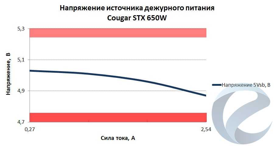 Без нагрузки напряжение источника дежурного питания составляет 5,14 В, что на 2,8 % больше номинального. При максимальной нагрузке напряжение проседает до 4,98 В, что на 0,4 % меньше номинального.