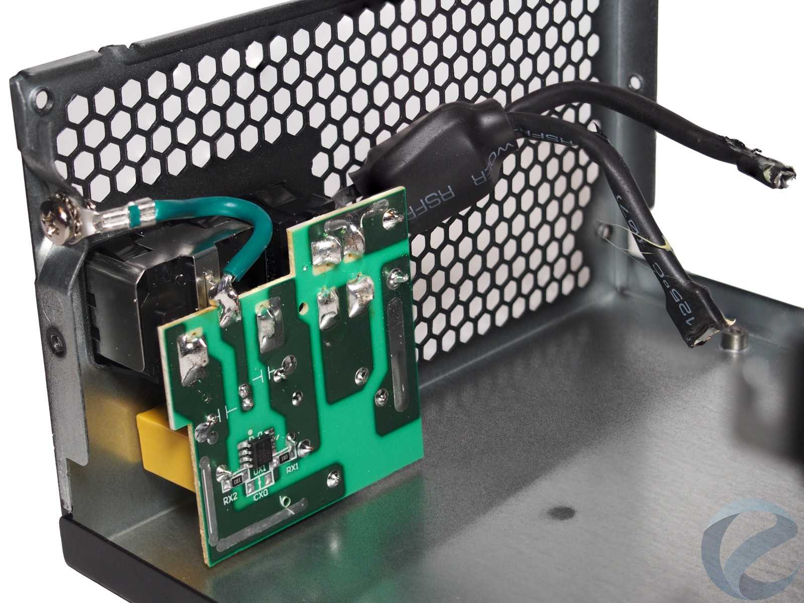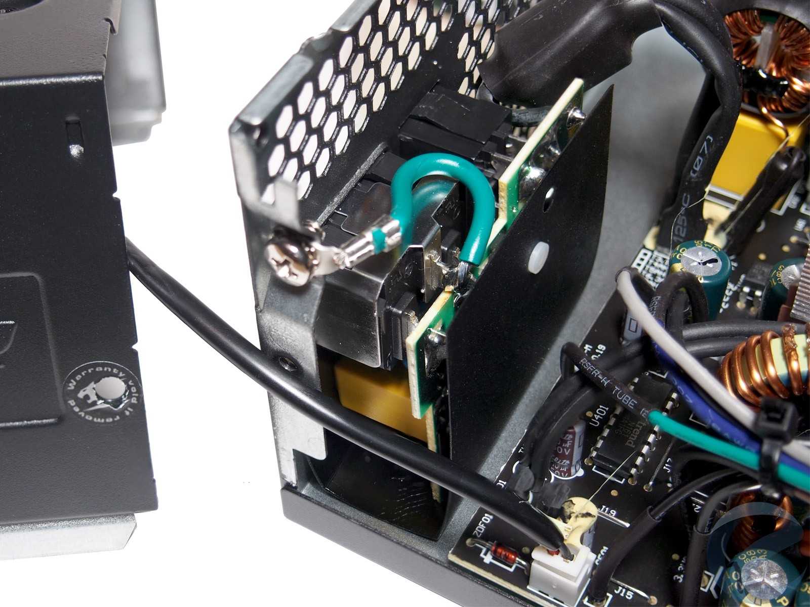 Сам процесс разбора не отличается от подобного процесса для большинства блоков питания. Корпус состоит из двух штампованных половин, соединенных винтовыми креплениями и пазами. Один из винтов закрыт гарантийной наклейкой, поэтому незаметно добраться до основной платы не получится.