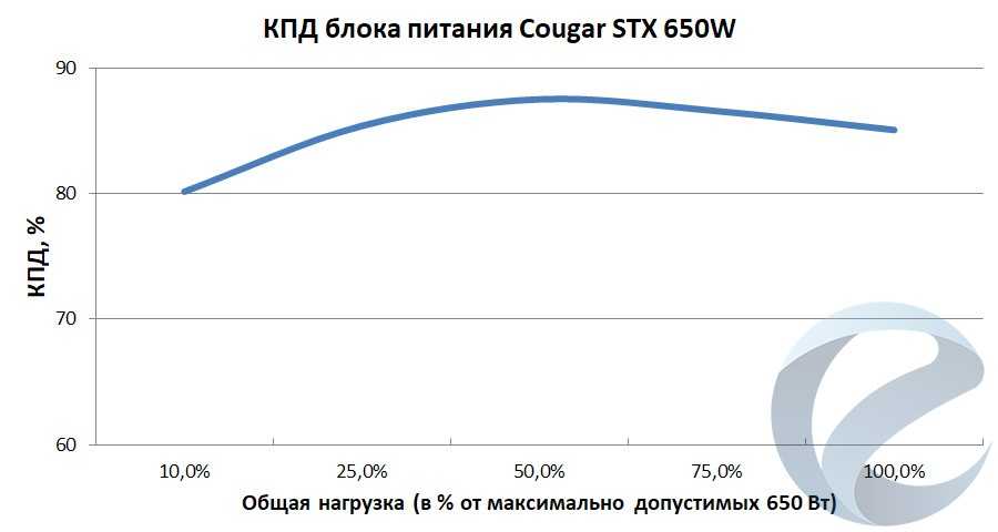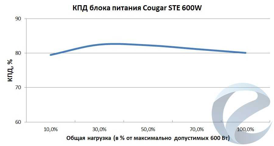 Блок питания Cougar STE 600W не проходил независимую сертификацию на соответствие стандарту 80 Plus. По собственным замерам в ходе тестов средний КПД составил около 81%, а пик достиг значения 83% при общей нагрузке в районе 40% мощности.