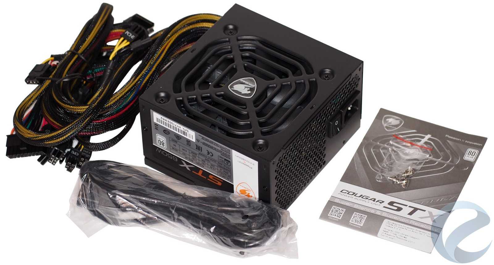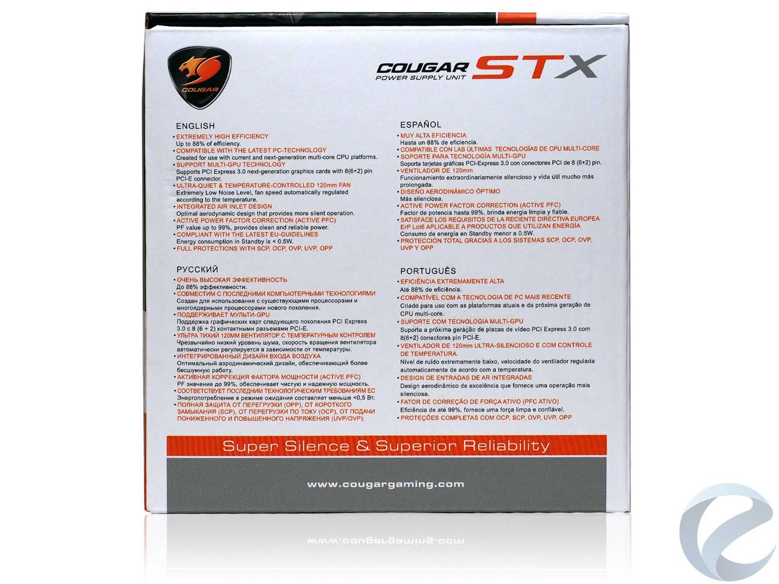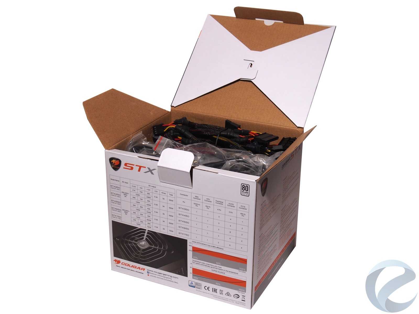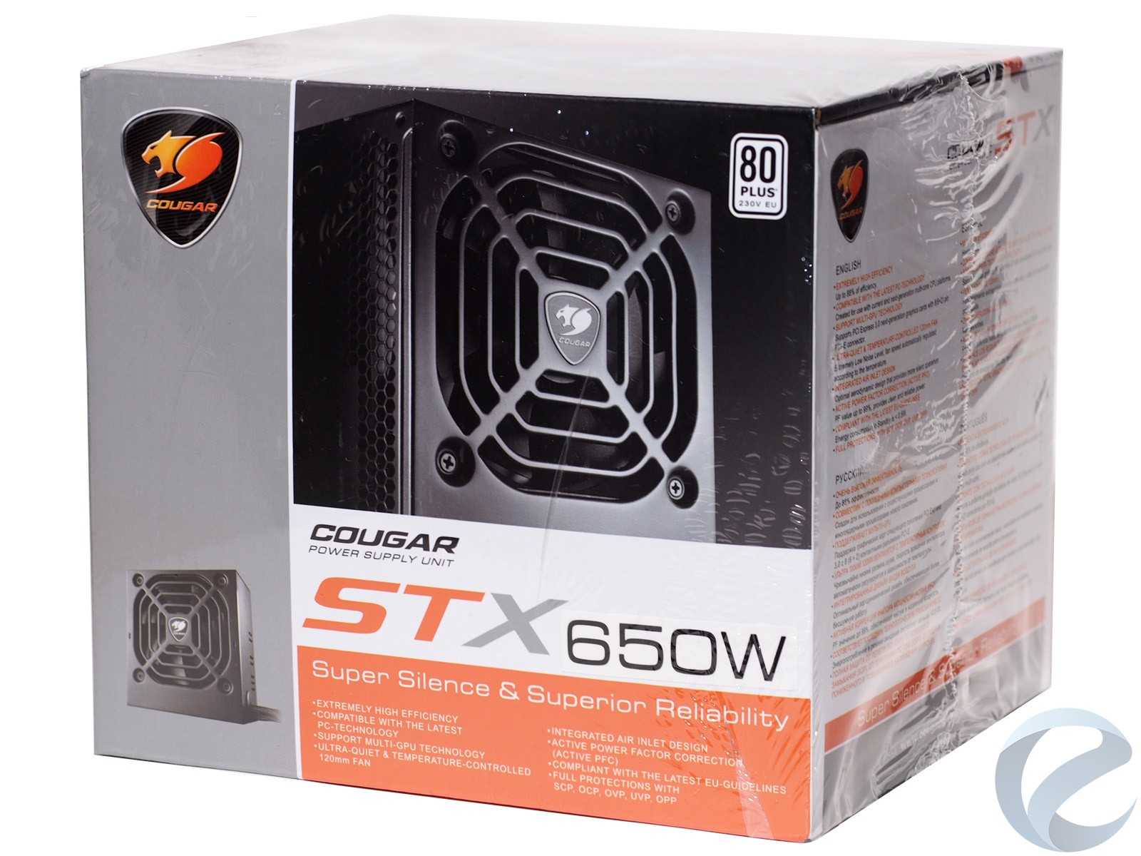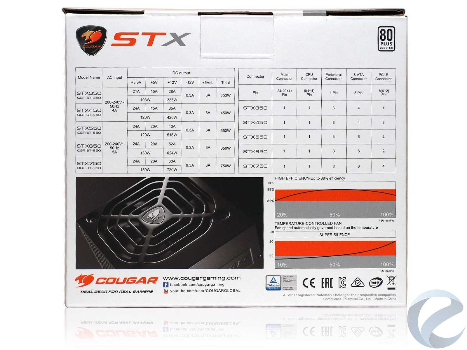 Максимальная мощность Cougar STX 650W — 650 Вт, при этом по спецификации блок питания выдаёт мощность по линии +12 В до 624 Вт, а в совокупности по +3,3 В и +5 В — до 130 Вт. В детализации по токам нагрузки расклад такой: