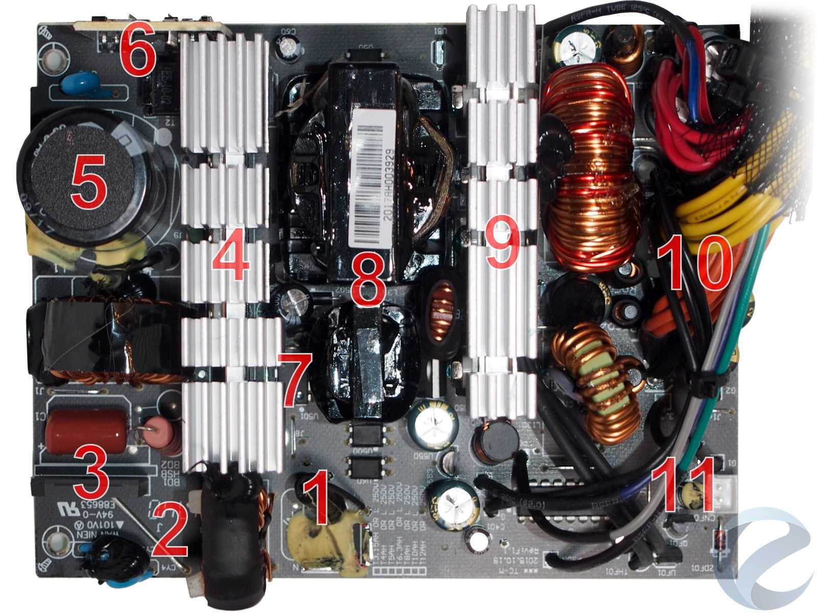 Примечание: перед разбором блока питания важно понимать, что этот процесс автоматически лишает гарантийного обслуживания, да и риск поражения электрическим током велик (на высоковольтных конденсаторах заряд может достаточно долго сохраняться после отключения от сети электропитания), поэтому самостоятельно этого лучше не делатьив случае поломокобращаться в специализированные сервисные центры.