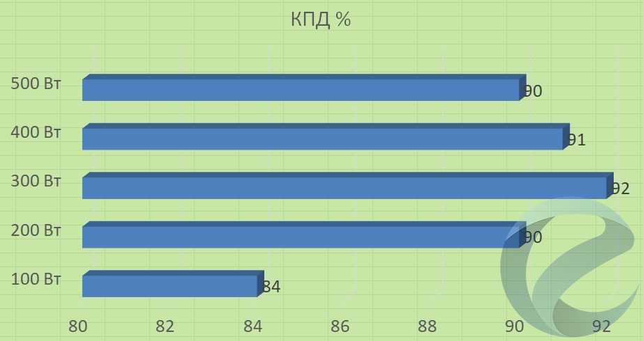Уровень КПД полностью соответствует стандарту 80 PLUS Gold, максимальные 92% демонстрируются при нагрузке 300 Вт.