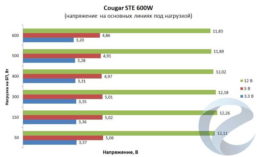 Стандарт ATX допускает 5% отклонения от номинала, блок питания Cougar STE 600W в них уложился, причем с неплохим запасом. В относительных величинах при максимальной нагрузке на БП отклонение напряжения на линии +12V оставалось в пределах 1,5% от номинала, линии +5V отклонение — до 2,8%, линии +3,3V — до 0,7%. На проводах падение будет выше, но напряжение останется достаточным для стабильной работы подключенных комплектующих.