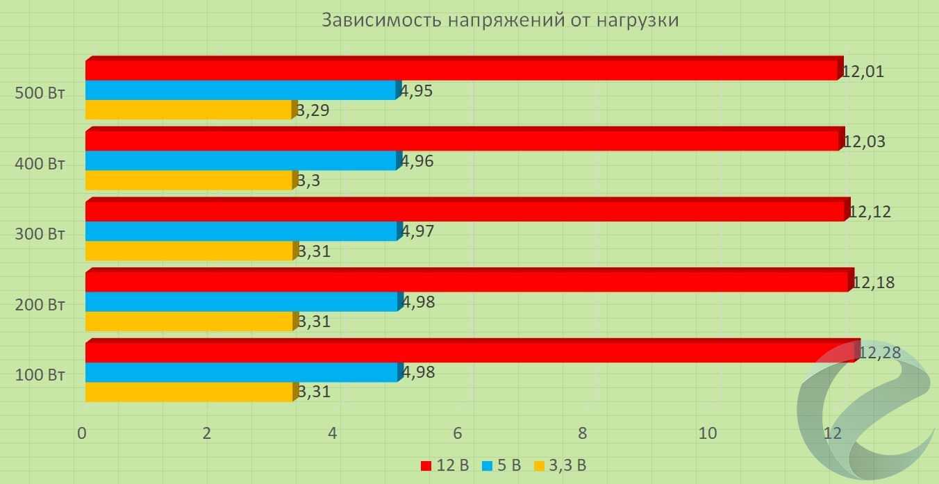 Значения укладываются в допустимый коридор отклонения 5% с неплохим запасом. Так, при максимальной общей нагрузке на блок питания, напряжение на линии +12V колеблется в пределах 0,3% от номинала, линии +5V отклонение — до 1,4%, линии +3,3V — до 2,1%. Отличный результат для бюджетного устройства.