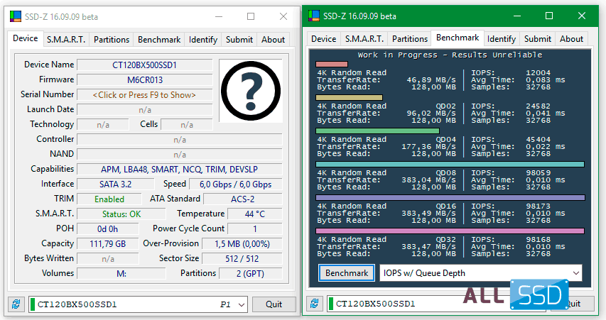 Программа SSD-Z видит диск и в бета-тесте выдает неплохие значения IOPS для недорого твердотельного накопителя.