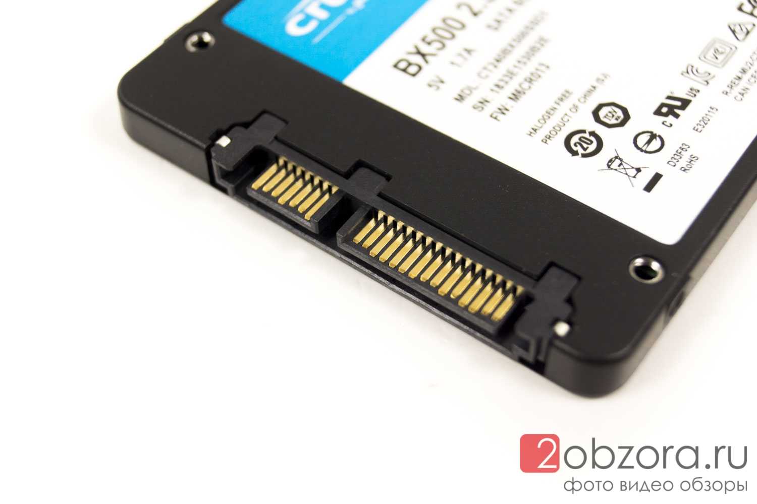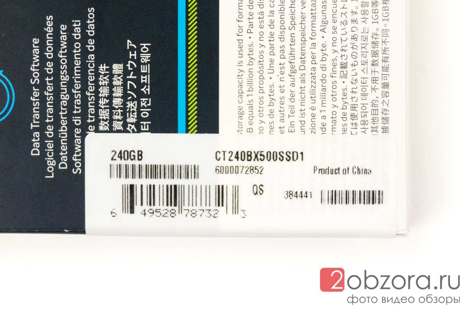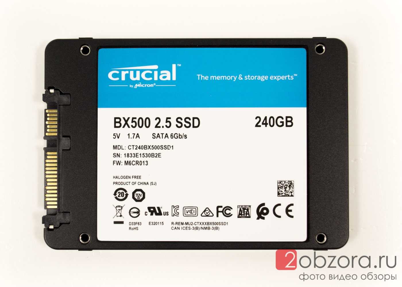 На фирменной наклейке за исключением трёх штрих-кодов, указан объем 240GB, полный номер модели накопителя CT240BX500SSD1 и страна производитель — Китай (кто бы сомневался).
