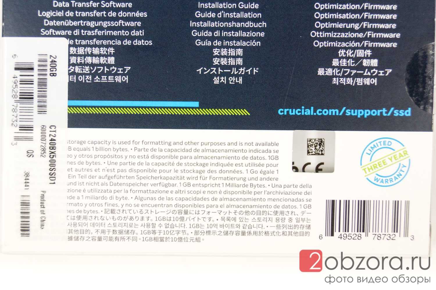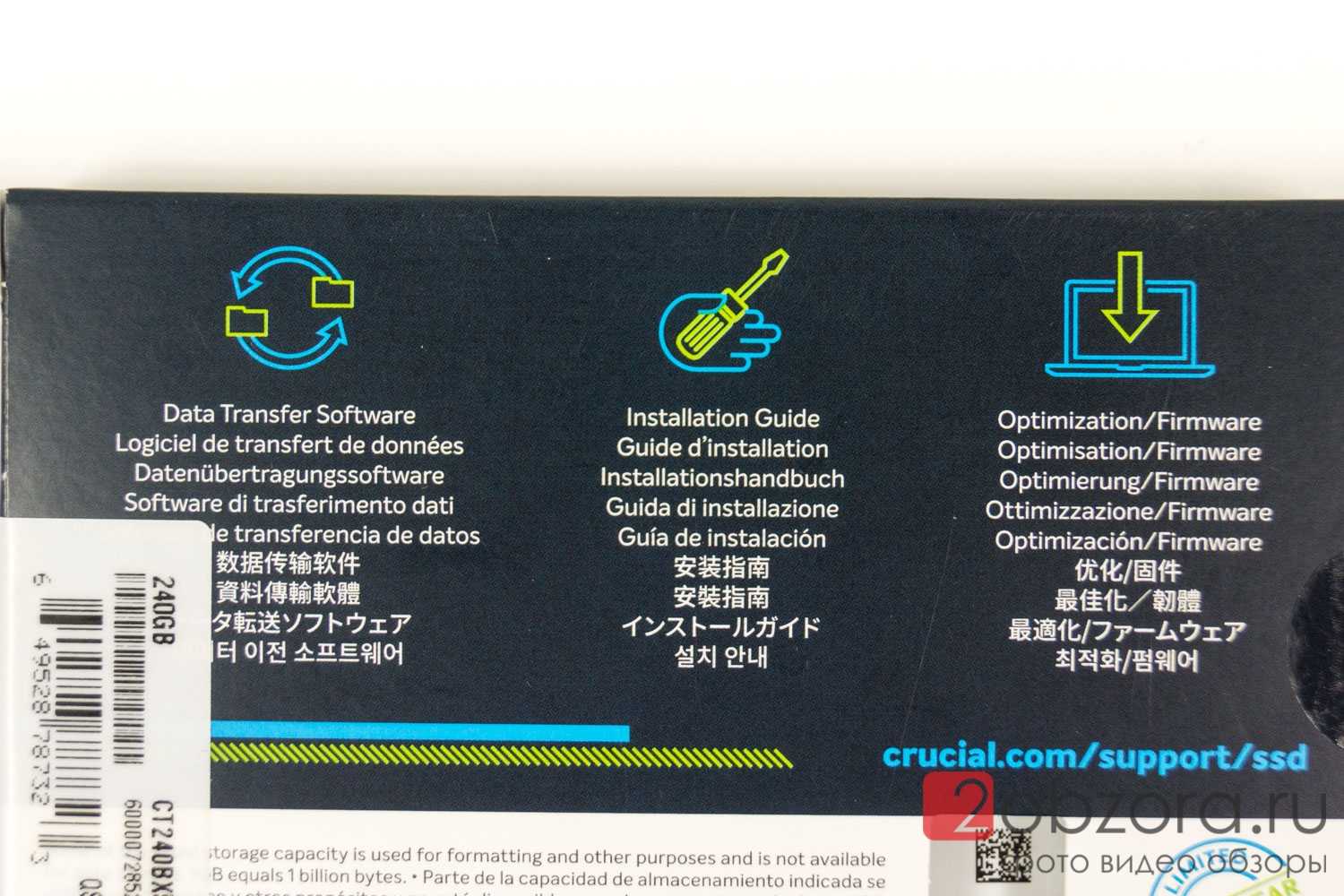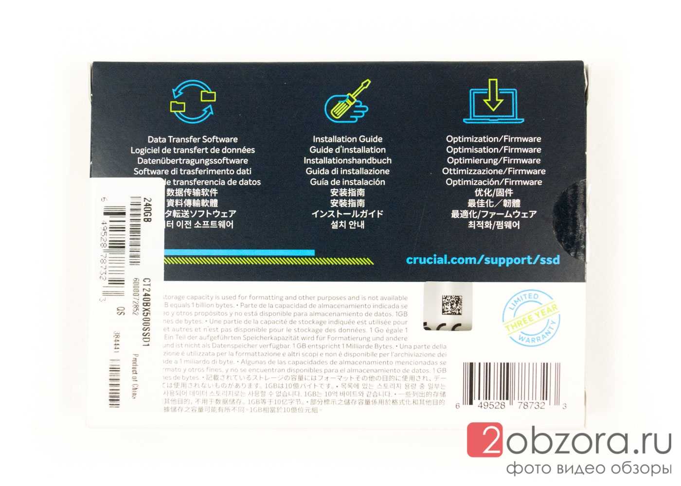 Возвращаемся к обратной стороне упаковки SSD диска BX500 и рассмотрим ее подробнее. На русском языке никакой информации. Но нам говорят, что есть софт для переноса/миграции данных, инструкция по установке и оптимизация/обновление при помощи прошивок (будем надеяться, что они реально будут выходить). Также указана ссылка на сайт производителя с поддержкой по твердотельным SSD накопителям.