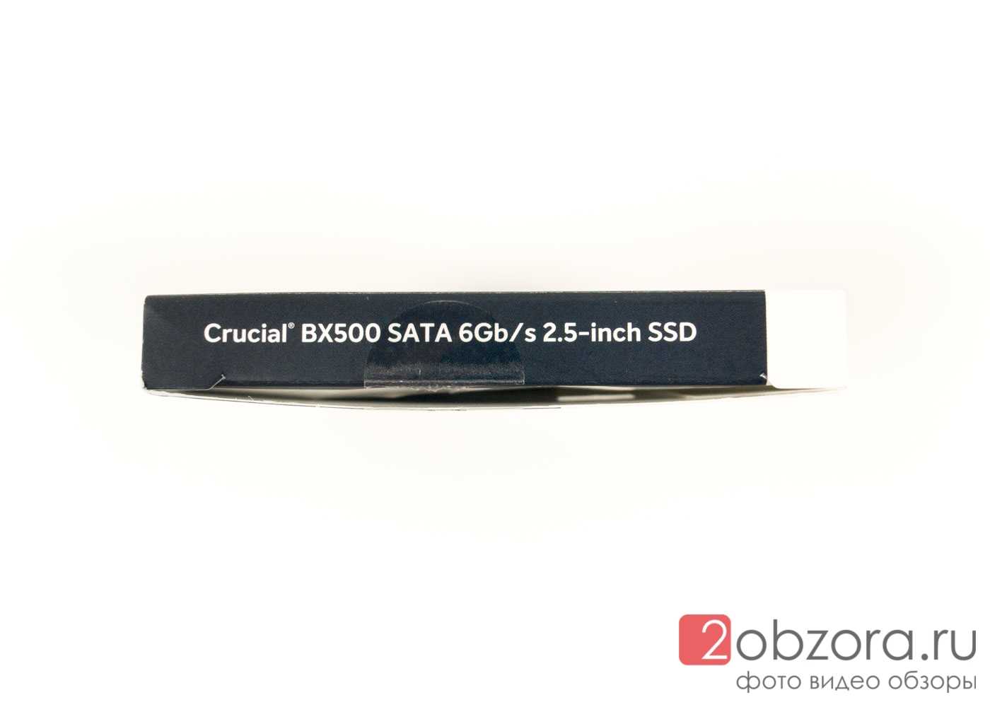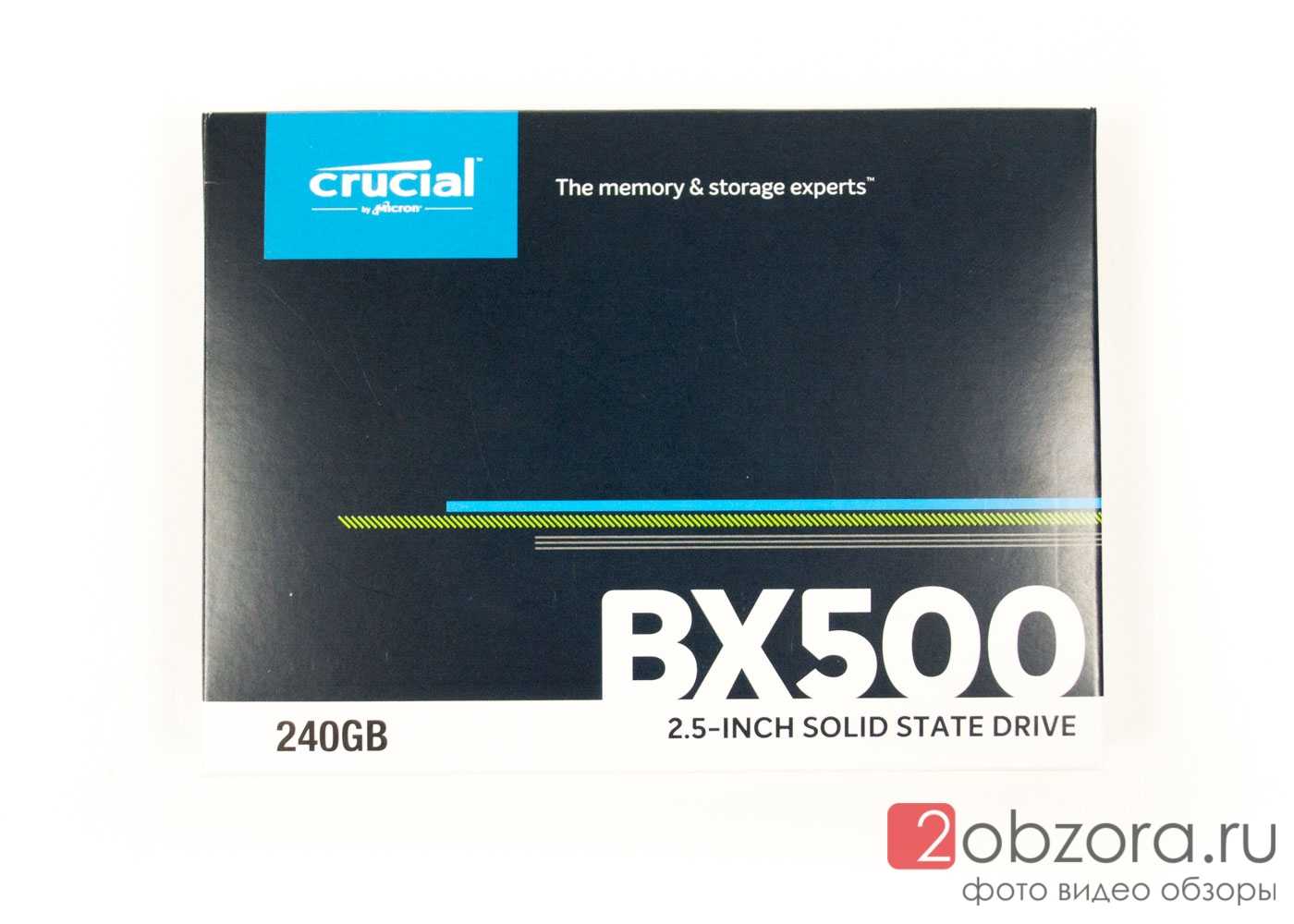 На лицевой стороне в верхнем левом углу указан бренд производителя Crucial (by Micron), слоган «The memory & storage expert» (эксперт в памяти и накопителях). Ниже, крупно указана модель накопителя BX500, объем 240 Гигабайт и форм-фактор 2,5″. С дизайном не замарочились, а это значит, что глаз покупателя не зацепится за него, на витрине в магазине.