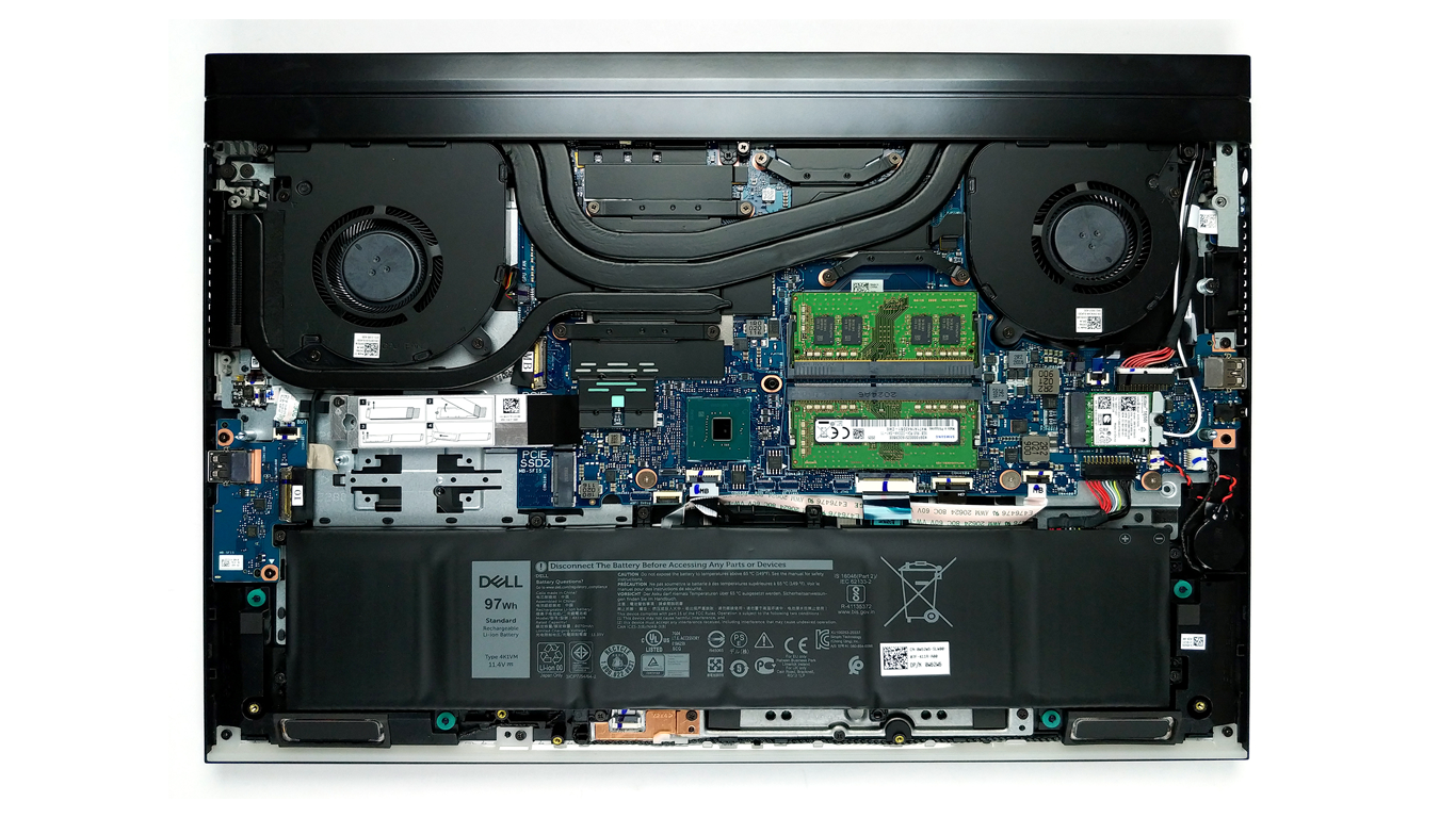 К нам на тест прибыла версия с аккумулятором повышенной емкости — на 97 Вт⋅ч, поэтому она лишена разъема SATA 6 Гбит/с и посадочного места под 2,5-дюймовый накопитель. В варианте G7 17 с 56-Вт⋅ч батареей установка HDD/SSD такого форм-фактора возможна.