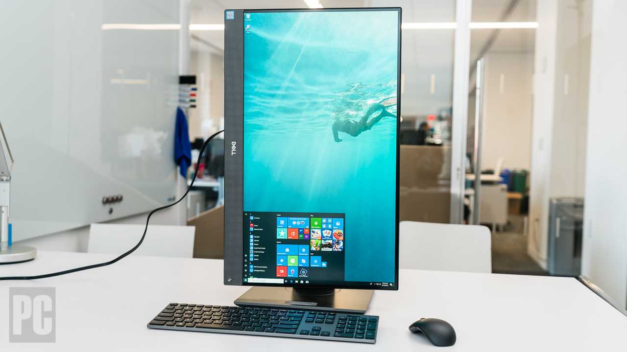 The stand allows for 4 inches of height adjustment, tilts 30 degrees back and 5 degrees forward, and swivels 45 degrees in either direction. Most AIO display stands, the one on the iMac included, provide only tilt adjustment. You can also pivot the display 90 degrees into portrait mode, as shown below. One thing you can’t do is recline the display fully to use it like a digital drafting station, in the way you can the incredibly flexible Microsoft Surface Studio 2.