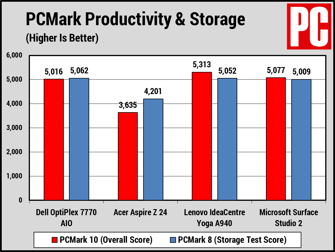 The OptiPlex 7770 failed to take advantage of its new CPU and finished behind the IdeaCentre Yoga A940 and Surface Studio 2 on PCMark 10, a somewhat disappointing result given its generational CPU edge. (This will recur even more clearly in the next test.) The systems with SSDs finished the PCMark 8 Storage test with similar scores all well ahead of the Aspire Z 24’s result, showing the speed edge any SSD enjoys over a traditional hard drive.
