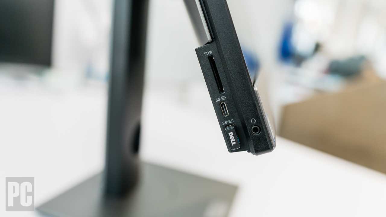 The OptiPlex 7770 All-in-One has no shortage of ports. Conveniently located on the left edge are an SD-card slot, a headphone jack, and two USB 3.1 ports, of both kinds: an older Type-A (shown below with a wireless dongle inserted), and a newer, smaller Type-C that supports 10Gbps USB 3.1 Gen 2.