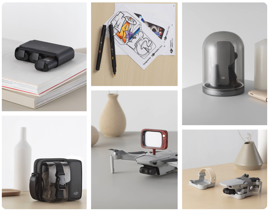- DJI Mini Bag — транспортировочная сумка для дрона и других сопутствующих предметов, таких как Osmo Action и Osmo Pocket.