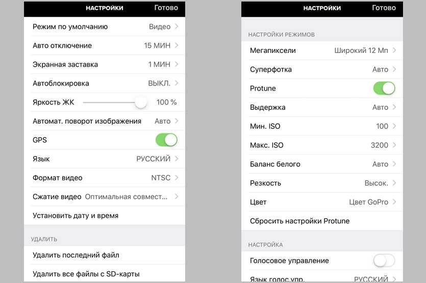 Конечно, GoPro HERO 7 Black также поддерживает ProTune, Когда ProTune включен, доступны пользовательские настройки для нажатия спуска, компенсации экспозиции, баланса белого, значения ISO, резкости или настроек звука. Также удобно переключаться между режимами фото, видео и покадровой съемки, проводя по экрану справа налево или слева направо. Если вы хотите выбрать другие режимы, вы перейдете к пункту меню изменения режима с соответствующим символом в режиме реального времени. Здесь вы можете выбрать режимы фото (одиночное фото, серийное фото, ночное фото) и видео режимы (TimeWarp видео, покадровой видео).