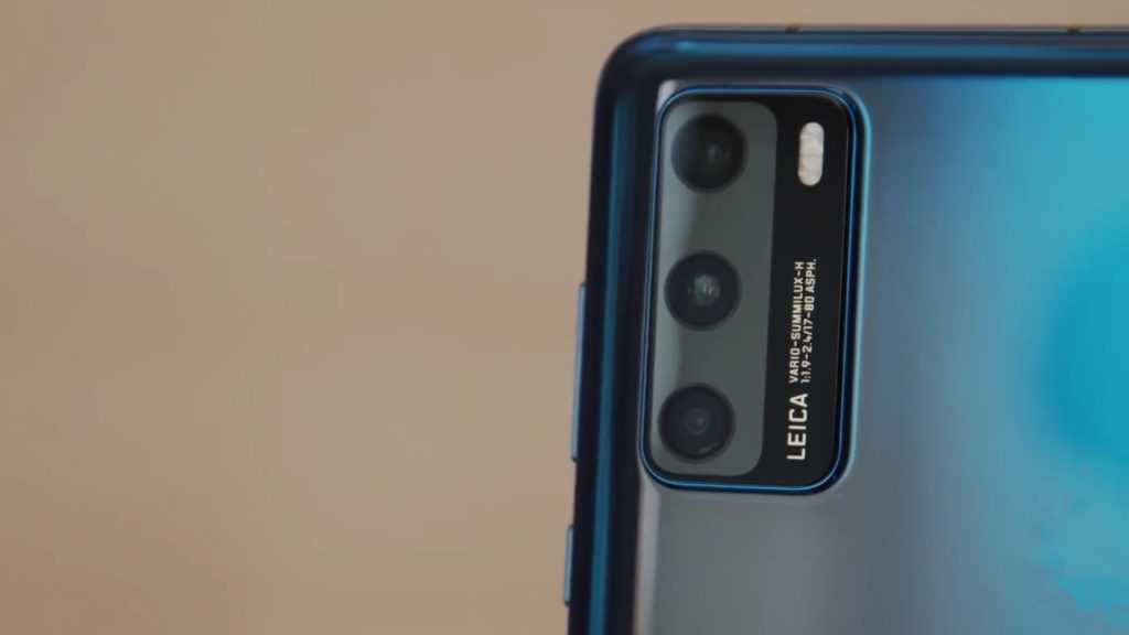 Huawei P40, задняя панель: в углу — блок тыльной камеры с тремя объективами и двойной светодиодной камерой