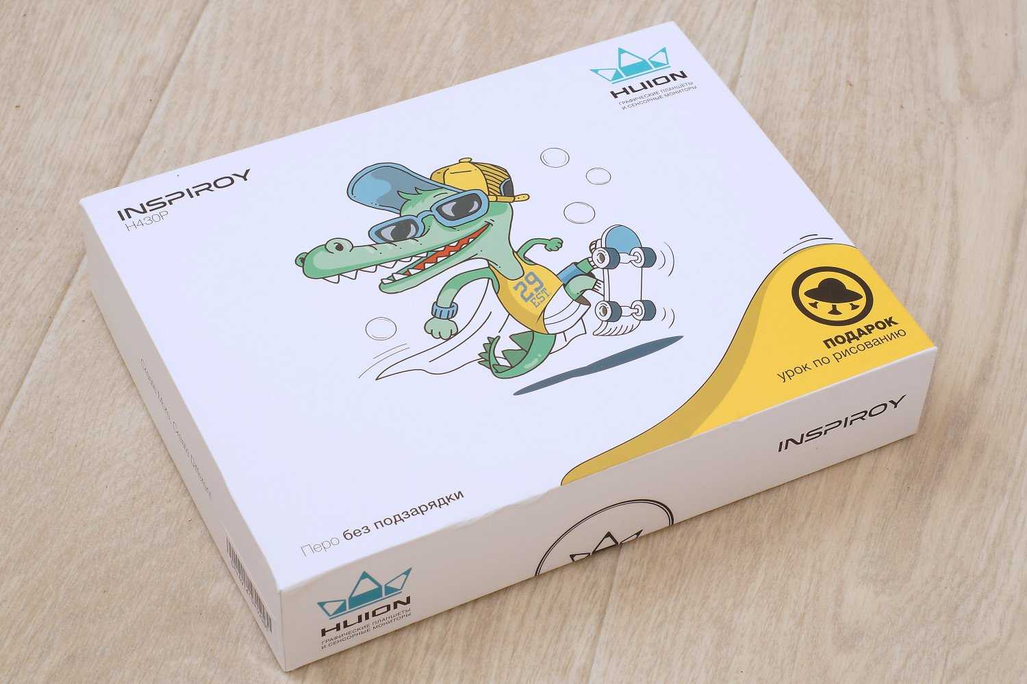 Желаниекомпании Huion выйти именно на российский рынок видно уже по оформлению упаковки – она полностью русскоязычная (предыдущие планшеты имели дизайн на английском языке плюс русскоязычные наклейки). Что касается модели графического планшета Huion H430P, то позиционируется она как «для начинающих» пользователей (детский рисунок с крокодилом плюсподарок в виде урока по рисованию). Сама коробка небольшая и легкая.
